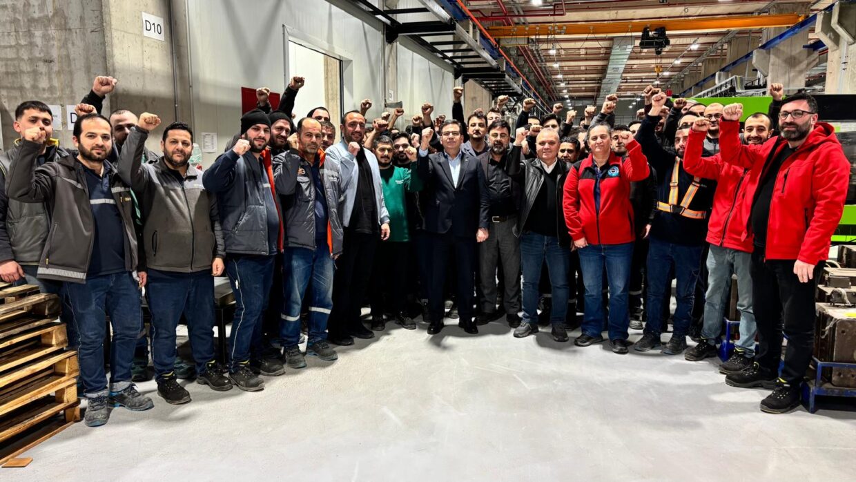 İskenderun Organize Sanayi Bölgesi’nde Befesa Silvermet işyerindeki üyelerimizi kapsayan ve çıkılan grevin 61. Gününde üyelerimizin memnuniyeti ve onayı ile toplu iş sözleşmemiz imzalanmıştı. DİSK Genel Başkan Yardımcısı, Sendikamız Genel Başkanı Özkan Atar, Sendikamız Genel Sekreteri Ali Çeltek ve Anadolu Şube yöneticilerimizle birlikte bugün Befesa Silvermet işyerini ziyaret etti. İşyerinde düzenlenen pasta töreninde konuşan Genel Başkanımız; İmzalanan sözleşmenin üyelerimize, işyerine ve sendikamıza hayırlı olması dileklerini paylaştı.