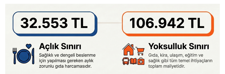 TÜİK zincir market cari ay internet fiyatları ve BİSAM Beslenme Kalıbı üzerinden yapılan hesaplamaya göre dört kişilik bir ailenin sağlıklı ve dengeli beslenmesi için aylık yapması gereken harcama tutarı Mart 2026 ortası itibariyle 32.553 liradır. Bu harcama tutarı sadece gıda için yapılması gereken minimum tutardır. Açlık sınırı üzerinden hanehalkı tüketim harcamaları esas alınarak yapılan hesaplama sonuçlarına göre ise yoksulluk sınırı 106.942 lira olarak gerçekleşmiştir.