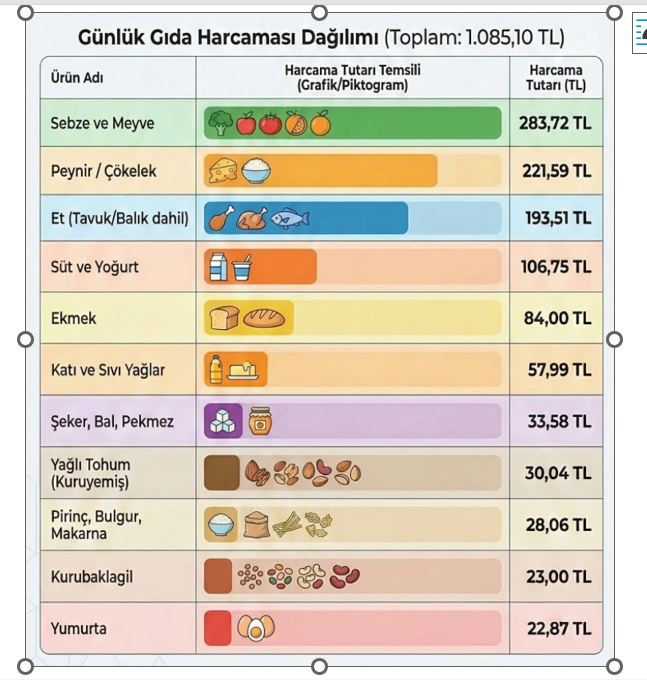 Günlük harcamalarda Mart 2026 ortası itibarıyla en yüksek maliyet grubunu 284 liralık harcama ile sebze ve meyve oluşturdu. Onu 222 liralık harcama gereksinimi ile süt ve yoğurt takip etti. Et ürünleri 194 lira harcama gereksinimi ile öne çıkan ürünlerdendi. Yumurta için yapılması gereken harcama tutarı 23 lira olarak gerçekleşti. Kurubaklagil için bu tutar 23, ekmek için 84, katı yağ ve sıvı yağ için 58, şeker, bal, reçel ve pekmez için ise 34 liradır. Kuruyemiş için ise yapılması gereken harcama miktarı 30 liradır.