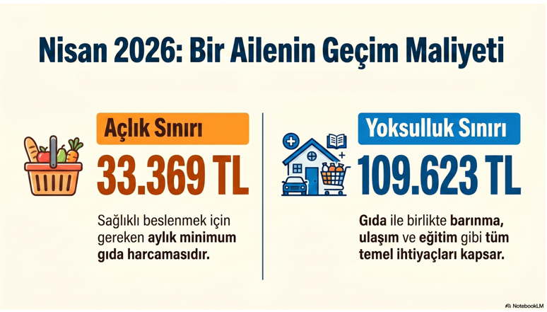 TÜİK zincir market cari ay internet fiyatları ve BİSAM Beslenme Kalıbı üzerinden yapılan hesaplamaya göre dört kişilik bir ailenin sağlıklı ve dengeli beslenmesi için aylık yapması gereken harcama tutarı Nisan 2026 için 33.369 liradır. Bu harcama tutarı sadece gıda için yapılması gereken minimum tutardır. Açlık sınırı üzerinden hanehalkı tüketim harcamaları esas alınarak yapılan hesaplama sonuçlarına göre ise yoksulluk sınırı 109.630 lira olarak gerçekleşmiştir.