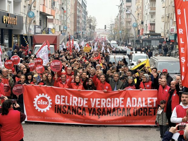 Gebze bugün tarihi günlerinden birini yaşadı. Adeta sel olup Gebze Kent Meydanına akan binlerce metal işçisi, MESS dayatmalarına karşı mücadele kararlılığını en güçlü şekilde gösterdi; sınıf kardeşleriyle omuz omuza yürüyerek insanca yaşam-insanca ücret, gelirde-vergide adalet talebini yükseltti. Konfederasyonumuz DİSK, “Gelirde-vergide adalet, insanca yaşanılacak ücret” talebiyle İstanbul Kartal Neyzen Tevfik Meydanı’ndan Ankara’ya doğru yürüyüşe geçti. Yürüyüş, ilk durağı olan Gebze’de binlerce metal işçisinin ve diğer işkollarından işçilerin katılımıyla mitinge döndü. Trafo Meydanı’nda toplanan binlerce metal işçisi, “İşçiler açken patronlara huzur yok”, MESS şaşırma, sabrımızı taşırma!”, “İnsanca yaşam insanca ücret”, “Gelirde adalet vergide adalet”, “İşgal grev direniş”, “Direne direne kazanacağız” sloganlarıyla Gebze Kent Meydanı’na doğru yürüyüşe geçti. Grevdeki Smart Solar işçilerinin en önde yürüdüğü kortejimizde Dilovası Katliamı’nda yaşamını yitiren 3’ü çocuk 6 kadın işçinin isimleri de taşındı. Yürüyüşe sendikamızla birlikte DİSK’e bağlı kardeş sendikalarımız, Gebze Sendikalar Birliği bileşenleri, Petrol-İş, Tekgıda-İş, Eğitim Sen, […]