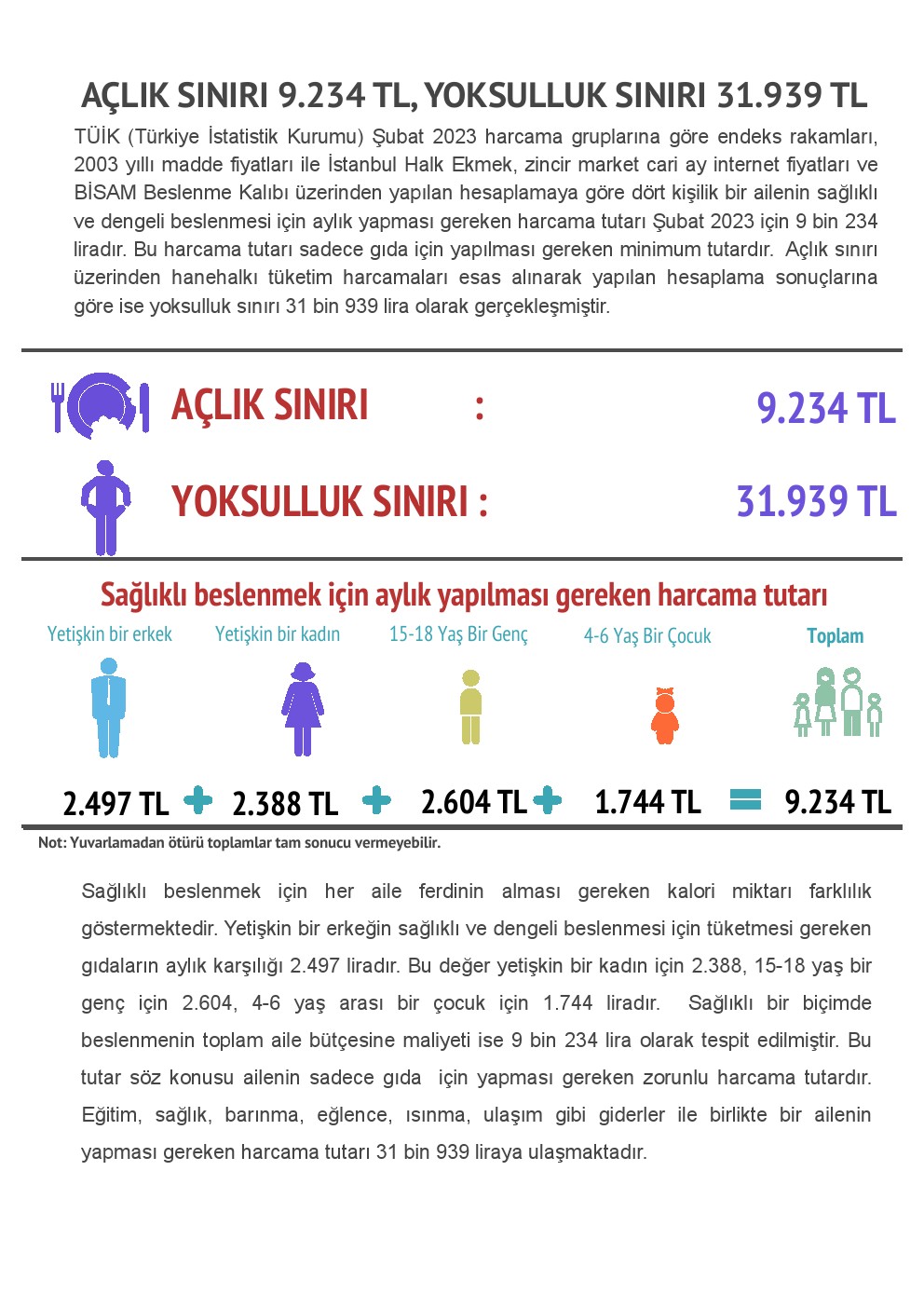 TÜİK (Türkiye İstatistik Kurumu) Şubat 2023 harcama gruplarına göre endeks rakamları, 2003 yıllı madde fiyatları ile İstanbul Halk Ekmek, zincir market cari ay internet fiyatları ve BİSAM Beslenme Kalıbı üzerinden yapılan hesaplamaya göre dört kişilik bir ailenin sağlıklı ve dengeli beslenmesi için aylık yapması gereken harcama tutarı Şubat 2023 için 9 bin 234 liradır. Bu harcama tutarı sadece gıda için yapılması gereken minimum tutardır. Açlık sınırı üzerinden hanehalkı tüketim harcamaları esas alınarak yapılan hesaplama sonuçlarına göre ise yoksulluk sınırı 31 bin 939 lira olarak gerçekleşmiştir.