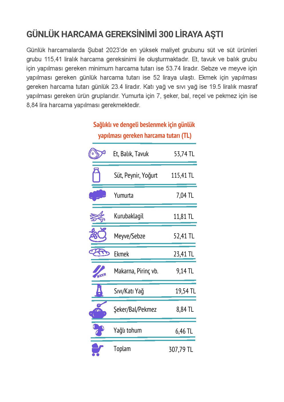 Günlük harcamalarda Şubat 2023’de en yüksek maliyet grubunu süt ve süt ürünleri grubu 115,41 liralık harcama gereksinimi ile oluşturmaktadır. Et, tavuk ve balık grubu için yapılması gereken minimum harcama tutarı ise 53.74 liradır. Sebze ve meyve için yapılması gereken günlük harcama tutarı ise 52 liraya ulaştı. Ekmek için yapılması gereken harcama tutarı günlük 23.4 liradır. Katı yağ ve sıvı yağ ise 19.5 liralık masraf yapılması gereken ürün gruplarıdır. Yumurta için 7, şeker, bal, reçel ve pekmez için ise 8,84 lira harcama yapılması gerekmektedir.