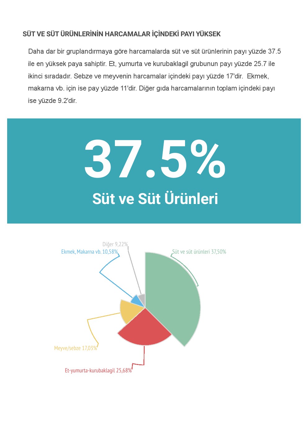 Daha dar bir gruplandırmaya göre harcamalarda süt ve süt ürünlerinin payı yüzde 37.5 ile en yüksek paya sahiptir. Et, yumurta ve kurubaklagil grubunun payı yüzde 25.7 ile ikinci sıradadır. Sebze ve meyvenin harcamalar içindeki payı yüzde 17’dir. Ekmek, makarna vb. için ise pay yüzde 11’dir. Diğer gıda harcamalarının toplam içindeki payı ise yüzde 9.2’dir.