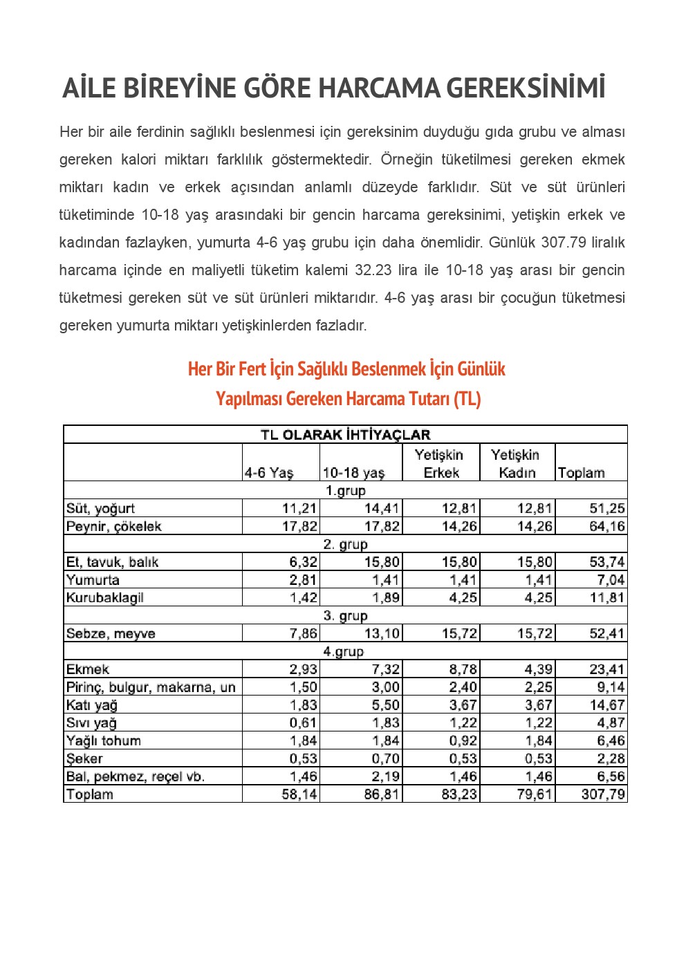 Her bir aile ferdinin sağlıklı beslenmesi için gereksinim duyduğu gıda grubu ve alması gereken kalori miktarı farklılık göstermektedir. Örneğin tüketilmesi gereken ekmek miktarı kadın ve erkek açısından anlamlı düzeyde farklıdır. Süt ve süt ürünleri tüketiminde 10-18 yaş arasındaki bir gencin harcama gereksinimi, yetişkin erkek ve kadından fazlayken, yumurta 4-6 yaş grubu için daha önemlidir. Günlük 307.79 liralık harcama içinde en maliyetli tüketim kalemi 32.23 lira ile 10-18 yaş arası bir gencin tüketmesi gereken süt ve süt ürünleri miktarıdır. 4-6 yaş arası bir çocuğun tüketmesi gereken yumurta miktarı yetişkinlerden fazladır.