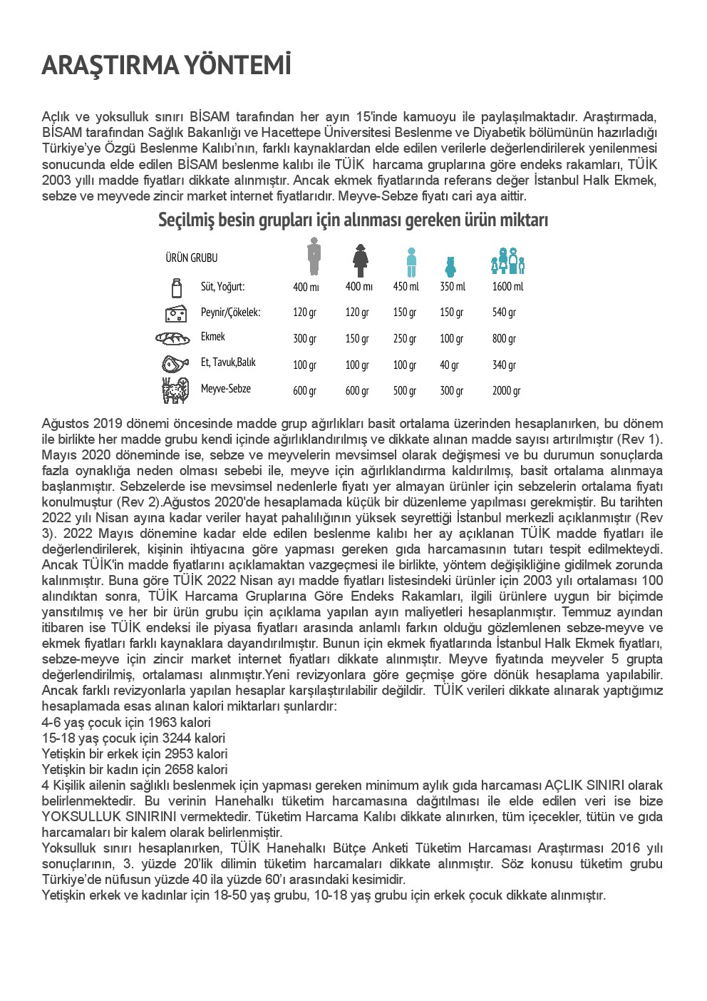 Ağustos 2019 dönemi öncesinde madde grup ağırlıkları basit ortalama üzerinden hesaplanırken, bu dönem ile birlikte her madde grubu kendi içinde ağırlıklandırılmış ve dikkate alınan madde sayısı artırılmıştır (Rev 1). Mayıs 2020 döneminde ise, sebze ve meyvelerin mevsimsel olarak değişmesi ve bu durumun sonuçlarda fazla oynaklığa neden olması sebebi ile, meyve için ağırlıklandırma kaldırılmış, basit ortalama alınmaya başlanmıştır. Sebzelerde ise mevsimsel nedenlerle fiyatı yer almayan ürünler için sebzelerin ortalama fiyatı konulmuştur (Rev 2).Ağustos 2020’de hesaplamada küçük bir düzenleme yapılması gerekmiştir. Bu tarihten 2022 yılı Nisan ayına kadar veriler hayat pahalılığının yüksek seyrettiği İstanbul merkezli açıklanmıştır (Rev 3). 2022 Mayıs dönemine kadar elde edilen beslenme kalıbı her ay açıklanan TÜİK madde fiyatları ile değerlendirilerek, kişinin ihtiyacına göre yapması gereken gıda harcamasının tutarı tespit edilmekteydi. Ancak TÜİK’in madde fiyatlarını açıklamaktan vazgeçmesi ile birlikte, yöntem değişikliğine gidilmek zorunda kalınmıştır. Buna göre TÜİK 2022 Nisan ayı madde fiyatları listesindeki ürünler için 2003 yılı ortalaması 100 alındıktan sonra, TÜİK Harcama Gruplarına Göre Endeks Rakamları, ilgili ürünlere uygun bir biçimde yansıtılmış ve her bir ürün grubu için açıklama yapılan ayın maliyetleri hesaplanmıştır. Temmuz ayından itibaren ise TÜİK endeksi ile piyasa fiyatları arasında anlamlı farkın olduğu gözlemlenen sebze-meyve ve ekmek fiyatları farklı kaynaklara dayandırılmıştır. Bunun için ekmek fiyatlarında İstanbul Halk Ekmek fiyatları, sebze-meyve için zincir market internet fiyatları dikkate alınmıştır. Meyve fiyatında meyveler 5 grupta değerlendirilmiş, ortalaması alınmıştır.Yeni revizyonlara göre geçmişe göre dönük hesaplama yapılabilir. Ancak farklı revizyonlarla yapılan hesaplar karşılaştırılabilir değildir. TÜİK verileri dikkate alınarak yaptığımız hesaplamada esas alınan kalori miktarları şunlardır: