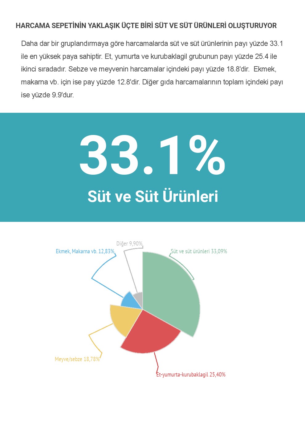 Daha dar bir gruplandırmaya göre harcamalarda süt ve süt ürünlerinin payı yüzde 33.1 ile en yüksek paya sahiptir. Et, yumurta ve kurubaklagil grubunun payı yüzde 25.4 ile ikinci sıradadır. Sebze ve meyvenin harcamalar içindeki payı yüzde 18.8’dir. Ekmek, makarna vb. için ise pay yüzde 12.8’dir. Diğer gıda harcamalarının toplam içindeki payı ise yüzde 9.9’dur.