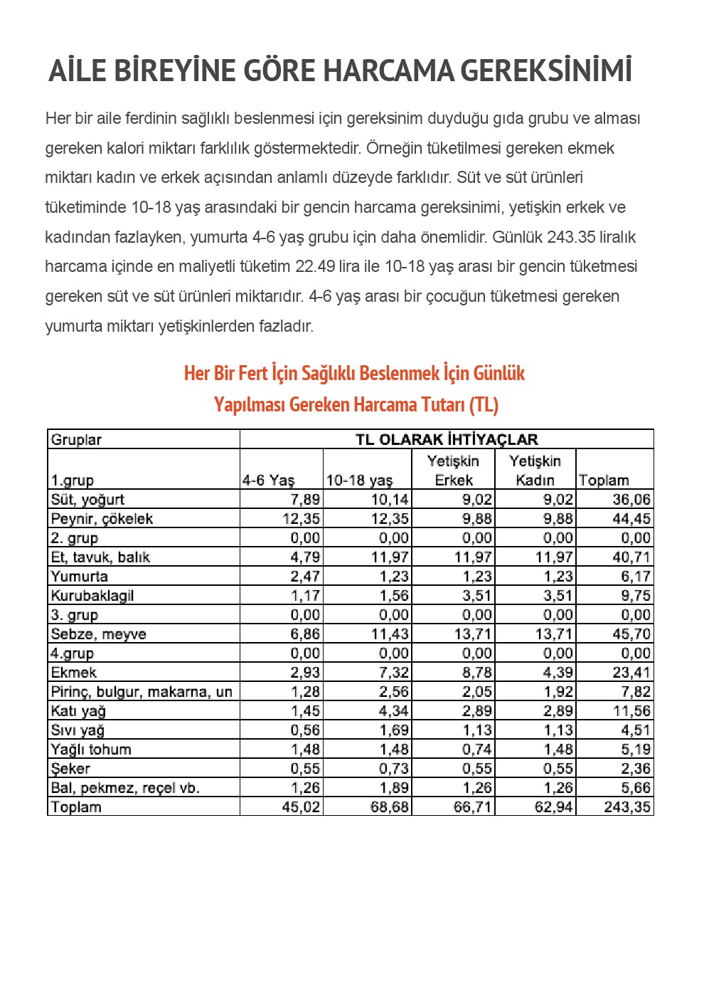 Her bir aile ferdinin sağlıklı beslenmesi için gereksinim duyduğu gıda grubu ve alması gereken kalori miktarı farklılık göstermektedir. Örneğin tüketilmesi gereken ekmek miktarı kadın ve erkek açısından anlamlı düzeyde farklıdır. Süt ve süt ürünleri tüketiminde 10-18 yaş arasındaki bir gencin harcama gereksinimi, yetişkin erkek ve kadından fazlayken, yumurta 4-6 yaş grubu için daha önemlidir. Günlük 243.35 liralık harcama içinde en maliyetli tüketim 22.49 lira ile 10-18 yaş arası bir gencin tüketmesi gereken süt ve süt ürünleri miktarıdır. 4-6 yaş arası bir çocuğun tüketmesi gereken yumurta miktarı yetişkinlerden fazladır.