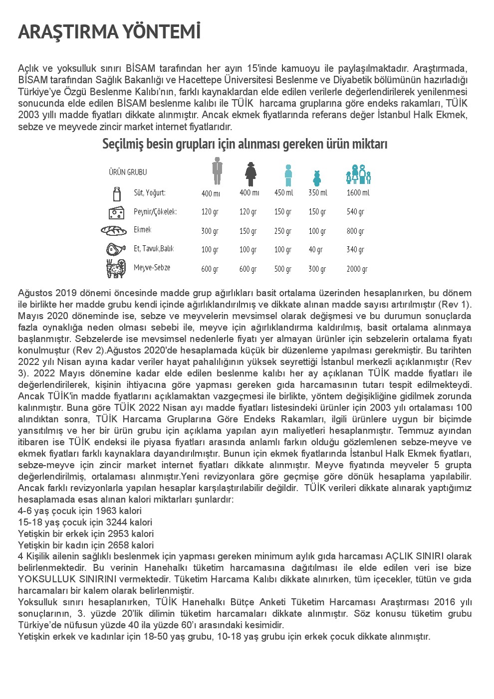 Ağustos 2019 dönemi öncesinde madde grup ağırlıkları basit ortalama üzerinden hesaplanırken, bu dönem ile birlikte her madde grubu kendi içinde ağırlıklandırılmış ve dikkate alınan madde sayısı artırılmıştır (Rev 1). Mayıs 2020 döneminde ise, sebze ve meyvelerin mevsimsel olarak değişmesi ve bu durumun sonuçlarda fazla oynaklığa neden olması sebebi ile, meyve için ağırlıklandırma kaldırılmış, basit ortalama alınmaya başlanmıştır. Sebzelerde ise mevsimsel nedenlerle fiyatı yer almayan ürünler için sebzelerin ortalama fiyatı konulmuştur (Rev 2).Ağustos 2020’de hesaplamada küçük bir düzenleme yapılması gerekmiştir. Bu tarihten 2022 yılı Nisan ayına kadar veriler hayat pahalılığının yüksek seyrettiği İstanbul merkezli açıklanmıştır (Rev 3). 2022 Mayıs dönemine kadar elde edilen beslenme kalıbı her ay açıklanan TÜİK madde fiyatları ile değerlendirilerek, kişinin ihtiyacına göre yapması gereken gıda harcamasının tutarı tespit edilmekteydi. Ancak TÜİK’in madde fiyatlarını açıklamaktan vazgeçmesi ile birlikte, yöntem değişikliğine gidilmek zorunda kalınmıştır. Buna göre TÜİK 2022 Nisan ayı madde fiyatları listesindeki ürünler için 2003 yılı ortalaması 100 alındıktan sonra, TÜİK Harcama Gruplarına Göre Endeks Rakamları, ilgili ürünlere uygun bir biçimde yansıtılmış ve her bir ürün grubu için açıklama yapılan ayın maliyetleri hesaplanmıştır. Temmuz ayından itibaren ise TÜİK endeksi ile piyasa fiyatları arasında anlamlı farkın olduğu gözlemlenen sebze-meyve ve ekmek fiyatları farklı kaynaklara dayandırılmıştır. Bunun için ekmek fiyatlarında İstanbul Halk Ekmek fiyatları, sebze-meyve için zincir market internet fiyatları dikkate alınmıştır. Meyve fiyatında meyveler 5 grupta değerlendirilmiş, ortalaması alınmıştır.Yeni revizyonlara göre geçmişe göre dönük hesaplama yapılabilir. Ancak farklı revizyonlarla yapılan hesaplar karşılaştırılabilir değildir. TÜİK verileri dikkate alınarak yaptığımız hesaplamada esas alınan kalori miktarları şunlardır:
