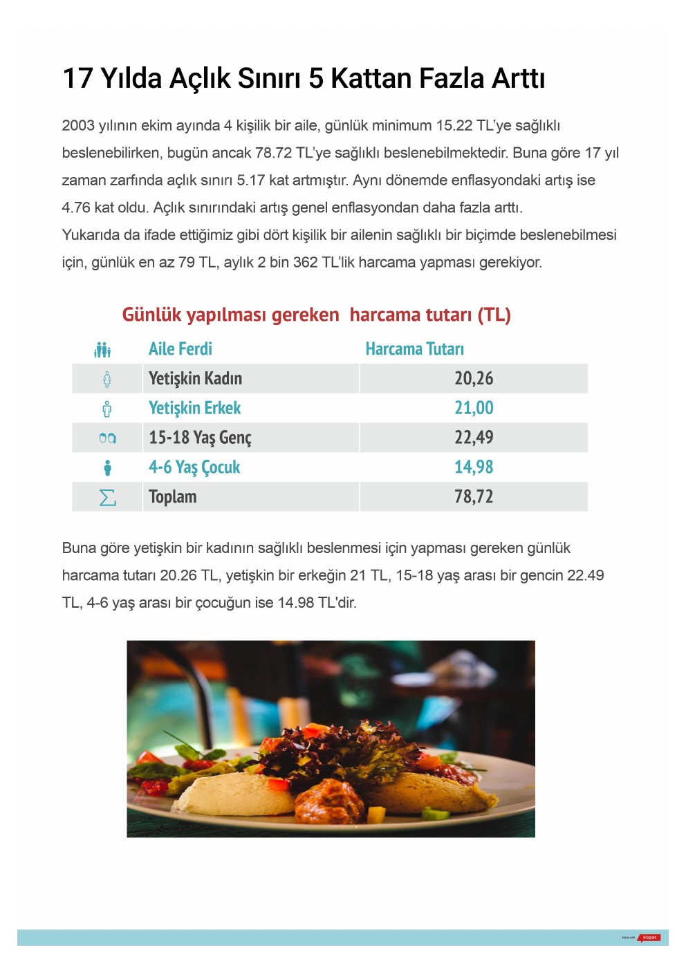 2003 yılının ekim ayında 4 kişilik bir aile, günlük minimum 15.22 TL’ye sağlıklı beslenebilirken, bugün ancak 78.72 TL’ye sağlıklı beslenebilmektedir. Buna göre 17 yıl zaman zarfında açlık sınırı 5.17 kat artmıştır. Aynı dönemde enflasyondaki artış ise 4.76 kat oldu. Açlık sınırındaki artış genel enflasyondan daha fazla arttı.