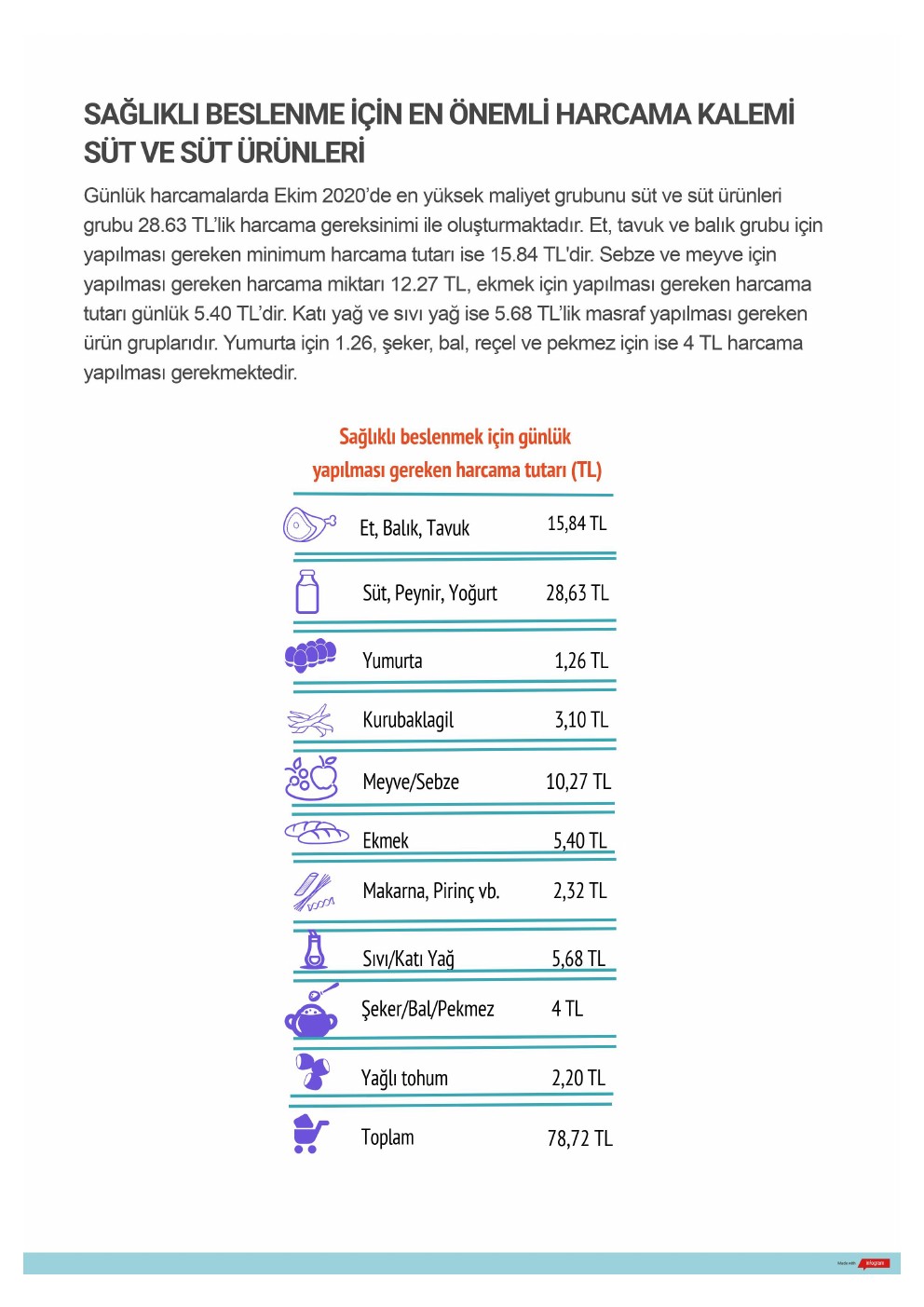 Günlük harcamalarda Ekim 2020’de en yüksek maliyet grubunu süt ve süt ürünleri grubu 28.63 TL’lik harcama gereksinimi ile oluşturmaktadır. Et, tavuk ve balık grubu için yapılması gereken minimum harcama tutarı ise 15.84 TL’dir. Sebze ve meyve için yapılması gereken harcama miktarı 12.27 TL, ekmek için yapılması gereken harcama tutarı günlük 5.40 TL’dir. Katı yağ ve sıvı yağ ise 5.68 TL’lik masraf yapılması gereken ürün gruplarıdır. Yumurta için 1.26, şeker, bal, reçel ve pekmez için ise 4 TL harcama yapılması gerekmektedir.