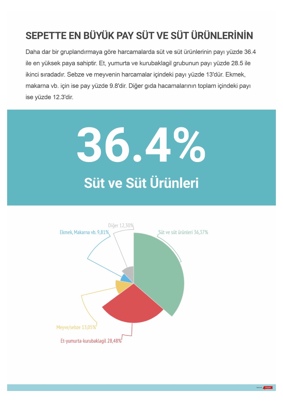 Daha dar bir gruplandırmaya göre harcamalarda süt ve süt ürünlerinin payı yüzde 36.4 ile en yüksek paya sahiptir. Et, yumurta ve kurubaklagil grubunun payı yüzde 28.5 ile ikinci sıradadır. Sebze ve meyvenin harcamalar içindeki payı yüzde 13’dür. Ekmek, makarna vb. için ise pay yüzde 9.8’dir. Diğer gıda hacamalarının toplam içindeki payı ise yüzde 12.3’dir.