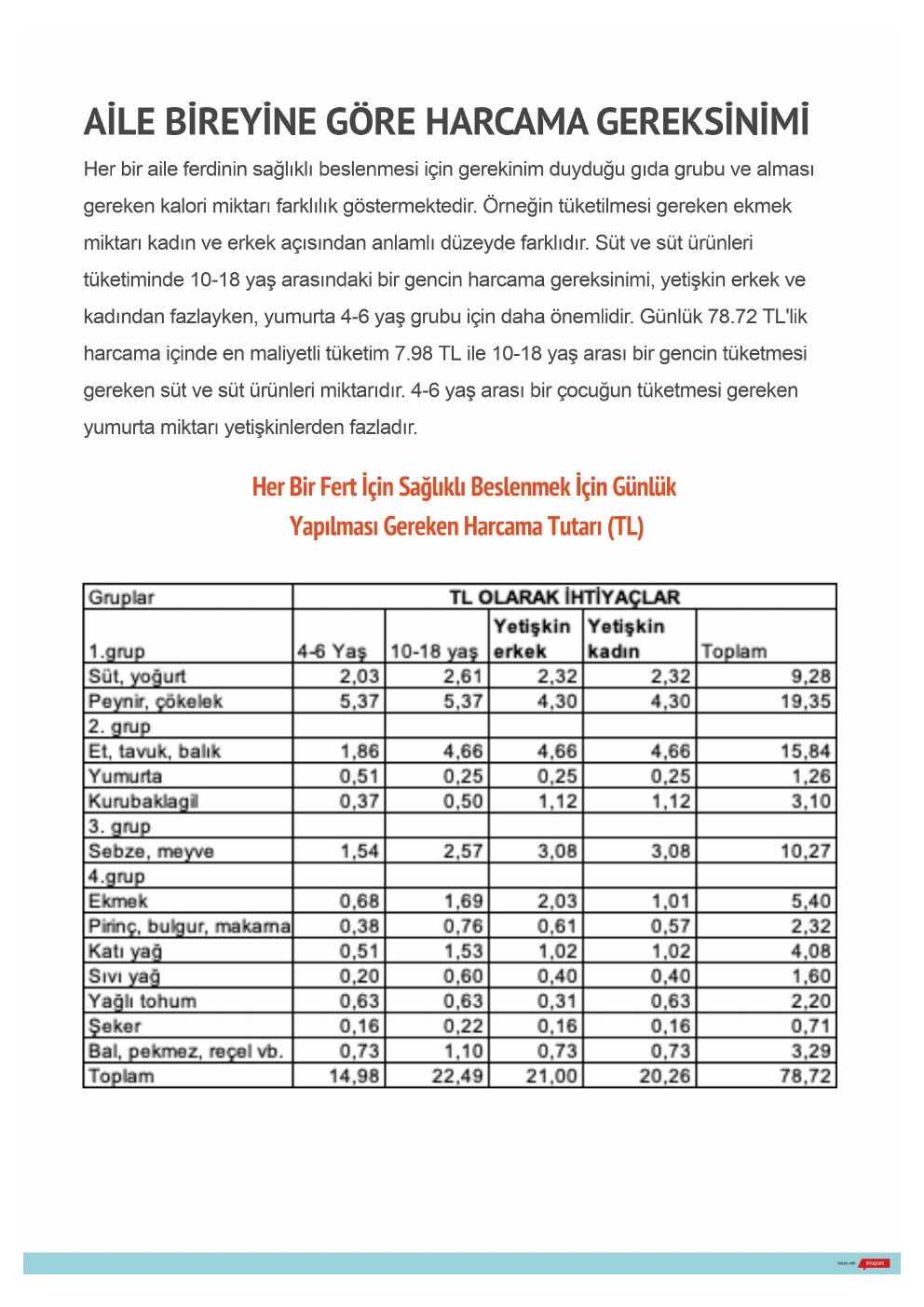 Her bir aile ferdinin sağlıklı beslenmesi için gerekinim duyduğu gıda grubu ve alması gereken kalori miktarı farklılık göstermektedir. Örneğin tüketilmesi gereken ekmek miktarı kadın ve erkek açısından anlamlı düzeyde farklıdır. Süt ve süt ürünleri tüketiminde 10-18 yaş arasındaki bir gencin harcama gereksinimi, yetişkin erkek ve kadından fazlayken, yumurta 4-6 yaş grubu için daha önemlidir. Günlük 78.68 TL’lik harcama içinde en maliyetli tüketim 7.97 TL ile 10-18 yaş arası bir gencin tüketmesi gereken süt ve süt ürünleri miktarıdır. 4-6 yaş arası bir çocuğun tüketmesi gereken yumurta miktarı yetişkinlerden fazladır.