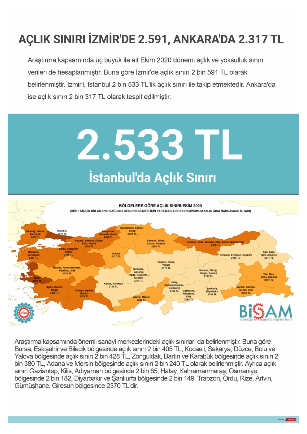 Araştırma kapsamında üç büyük ile ait Ekim 2020 dönemi açlık ve yoksulluk sınırı verileri de hesaplanmıştır. Buna göre İzmir’de açlık sınırı 2 bin 591 TL olarak belirlenmiştir. İzmir’i, İstanbul 2 bin 533 TL’lik açlık sınırı ile takip etmektedir. Ankara’da ise açlık sınırı 2 bin 317 TL olarak tespit edilmiştir.