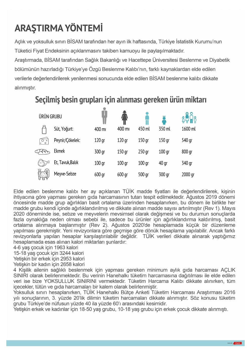 Sağlıklı beslenmek için her aile ferdinin alması gereken kalori miktarı farklılık göstermektedir. Yetişkin bir erkeğin sağlıklı bir biçimde beslenmesi için tüketmesi gereken gıdaların aylık karşılığı 630 TL’dir. Bu değer yetişkin bir kadın için 608 TL, 15-18 yaş bir genç için 675 TL, 4-6 yaş arası bir çocuk için 449 TL’dir. Sağlıklı bir biçimde beslenmenin toplam aile bütçesine maliyeti ise 2 bin 362 TL olarak tespit edilmiştir. Bu tutar söz konusu ailenin sadece gıda harcamaları için yapması gereken zorunlu tutardır. Eğitim, sağlık, barınma, eğlence, ısınma, ulaşım gibi giderler ile birlikte bir ailenin yapması gereken harcama tutarı 8 bin 169 TL’ye ulaşmaktadır.