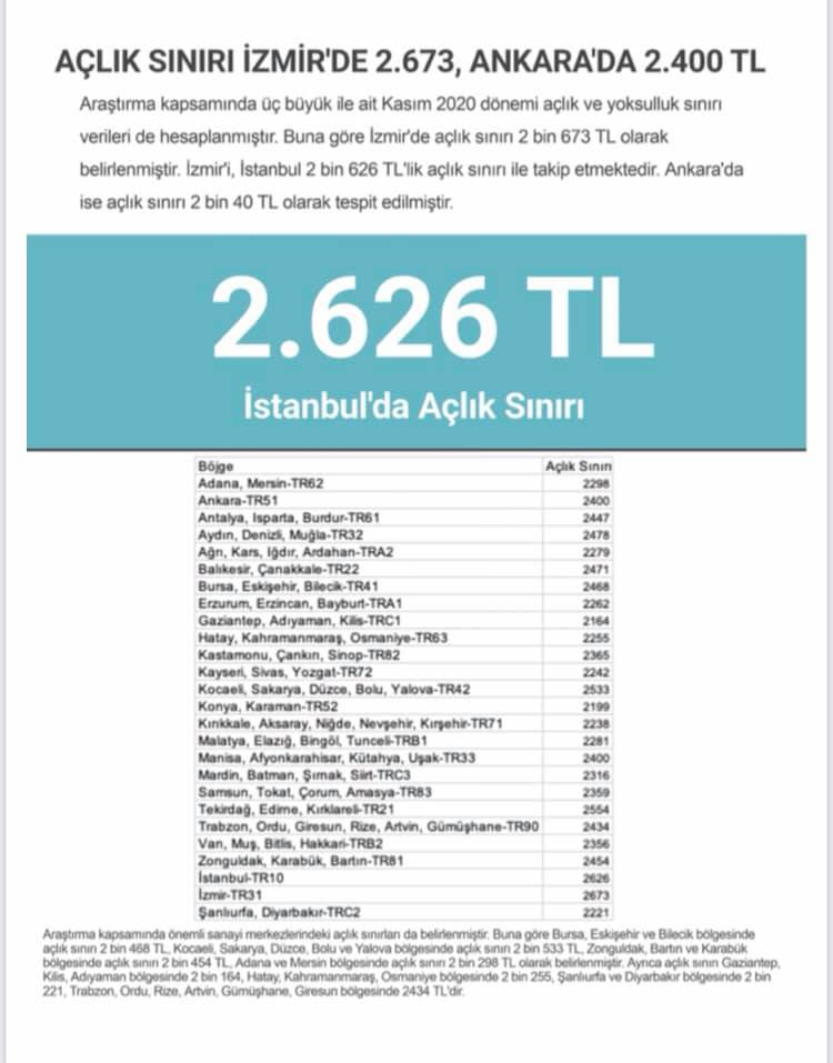 - AÇLIK SINIRI İSTANBUL’DA 2 BİN 626, İZMİR’DE 2 BİN 673, ANKARA’DA 2 BİN 400 LİRA