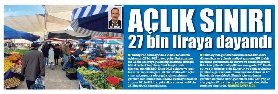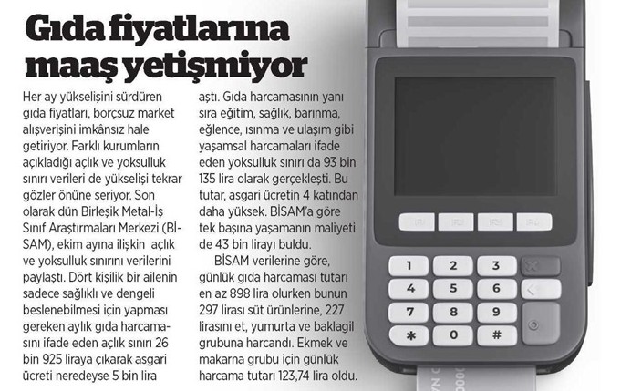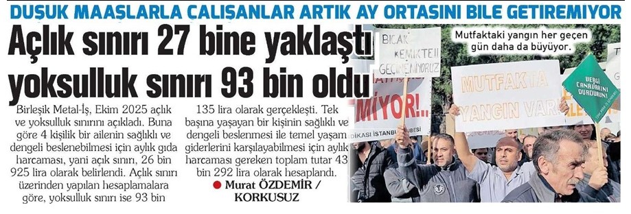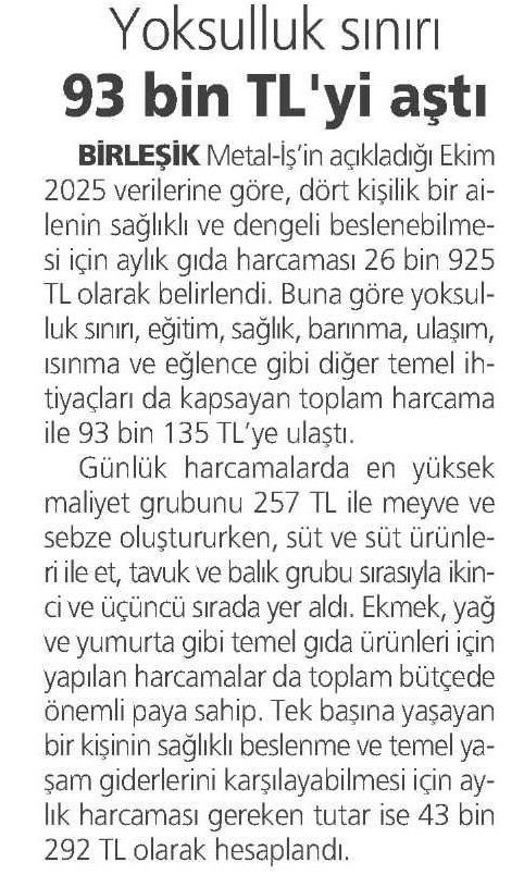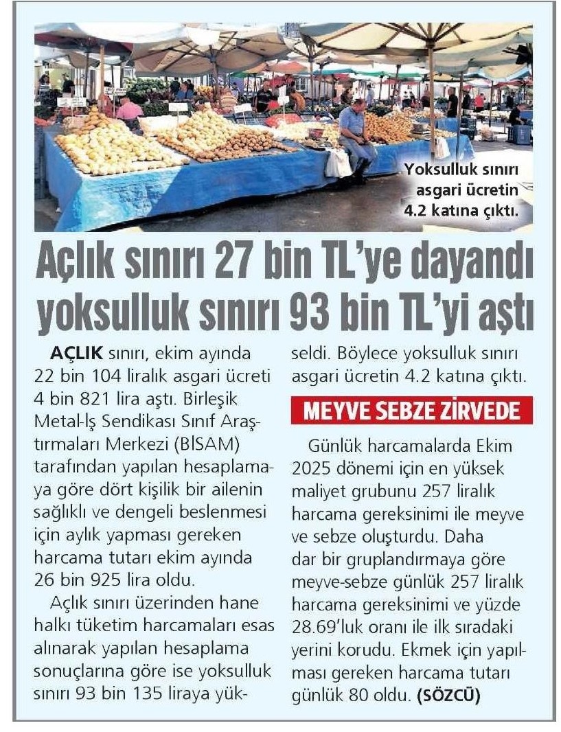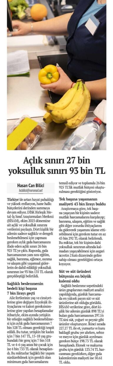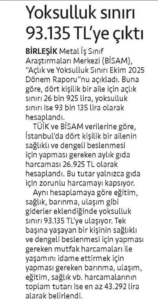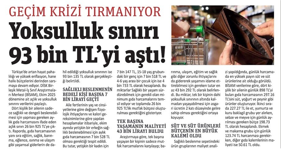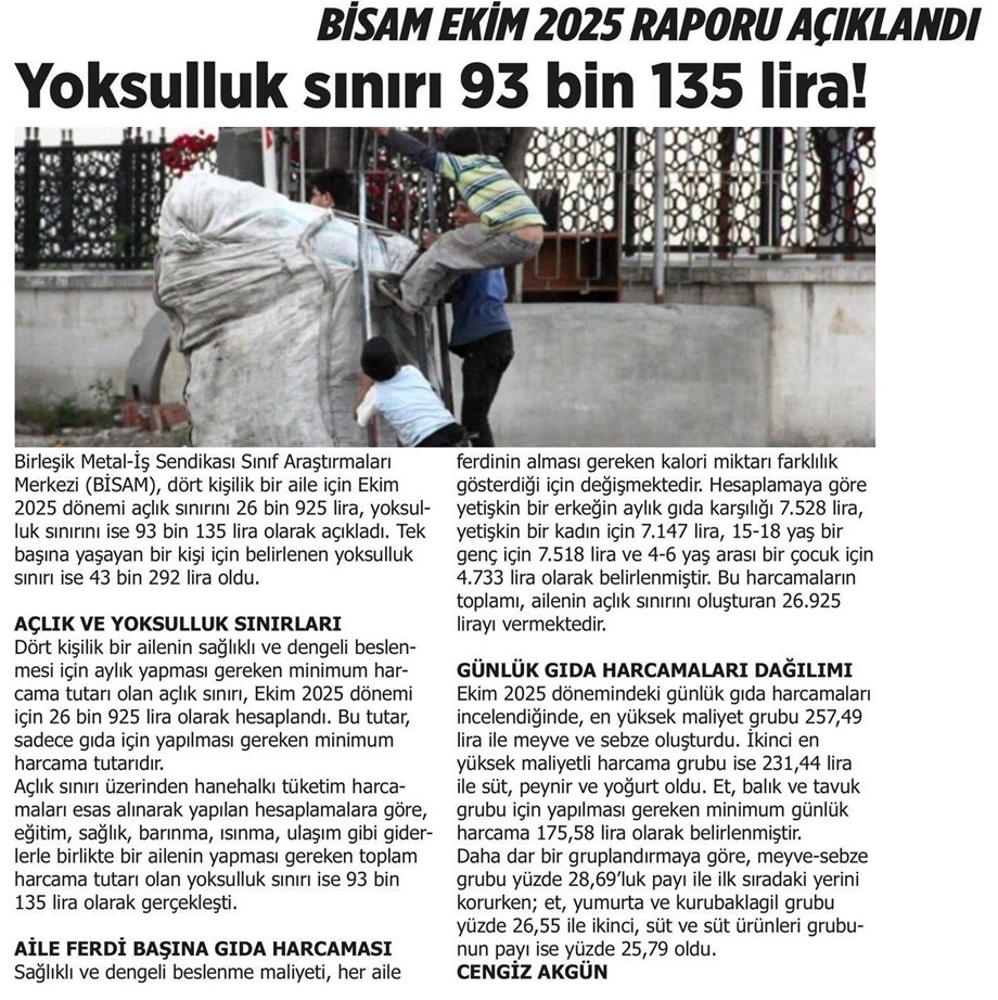 BASIN BÜLTENİ: Sendikamızın Sınıf Araştırmaları Merkezi BİSAM, ‘Açlık ve Yoksulluk Sınırı Ekim 2025 Dönem Raporu’nu açıkladı. Buna göre, dört kişilik bir aile için açlık sınırı 26 bin 925 lira oldu; yoksulluk sınırı ise 93 bin 135 lira! Ekim 2025 dönemi için; TÜİK (Türkiye İstatistik Kurumu) harcama gruplarına göre endeks rakamları, 2003 yıllı madde fiyatları ile İstanbul Halk Ekmek, zincir market cari ay internet fiyatları ve BİSAM Beslenme Kalıbı üzerinden yapılan hesaplamaya göre dört kişilik bir ailenin sağlıklı ve dengeli beslenmesi için aylık yapması gereken harcama tutarı Ekim 2025 için 26 bin 925 liradır. Bu harcama tutarı sadece gıda için yapılması gereken minimum tutardır. Açlık sınırı üzerinden hanehalkı tüketim harcamaları esas alınarak yapılan hesaplama sonuçlarına göre ise yoksulluk sınırı 93 bin 135 lira olarak gerçekleşmiştir. Sağlıklı ve dengeli beslenmek için her aile ferdinin alması gereken kalori miktarı farklılık göstermektedir. Yetişkin bir […]