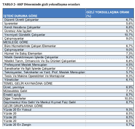 Buna göre son 15 yıllık dönemde (Haziran 2003-Haziran 2018) gizli yoksullaşmayı en yoğun olarak yaşayanlar, işteki duruma göre yüzde 10.7 ile “Yevmiyeliler”, temel gelir kaynağına göre yüzde 10.5 ile diğer transferlerle geçinenler oldu. Enflasyon nedeniyle yaşanan gizli yoksullaşma, en yoksul yüzde 20 için yüzde 9.3 seviyesinde gerçekleşti. Buna karşın en zengin yüzde 20 için gizli yoksullaşma yüzde 5.7 oldu.