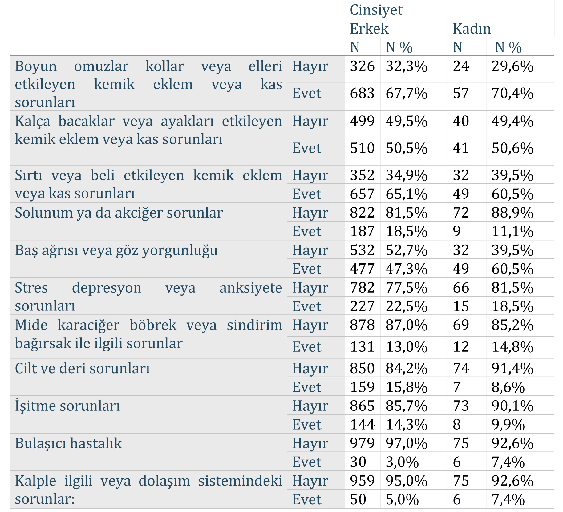 Kadınların yüzde 70’i boyun, omuzlar, kollar veya elleri etkileyen kemik, eklem veya kas sorunları; yüzde 50,6’sı kalça, bacaklar veya ayakları etkileyen kemik, eklem veya kas sorunları; yüzde 60,5’i sırtı ve belli etkileyen sorunlar ile baş ağrısı ve göz yorgunluğu yaşadığını ifade etmektedir. Kadınlar baş ağrısı ve göz yorgunluğunu erkeklere göre istatistiksel olarak anlamlı bir biçimde daha fazla yaşamaktadır.