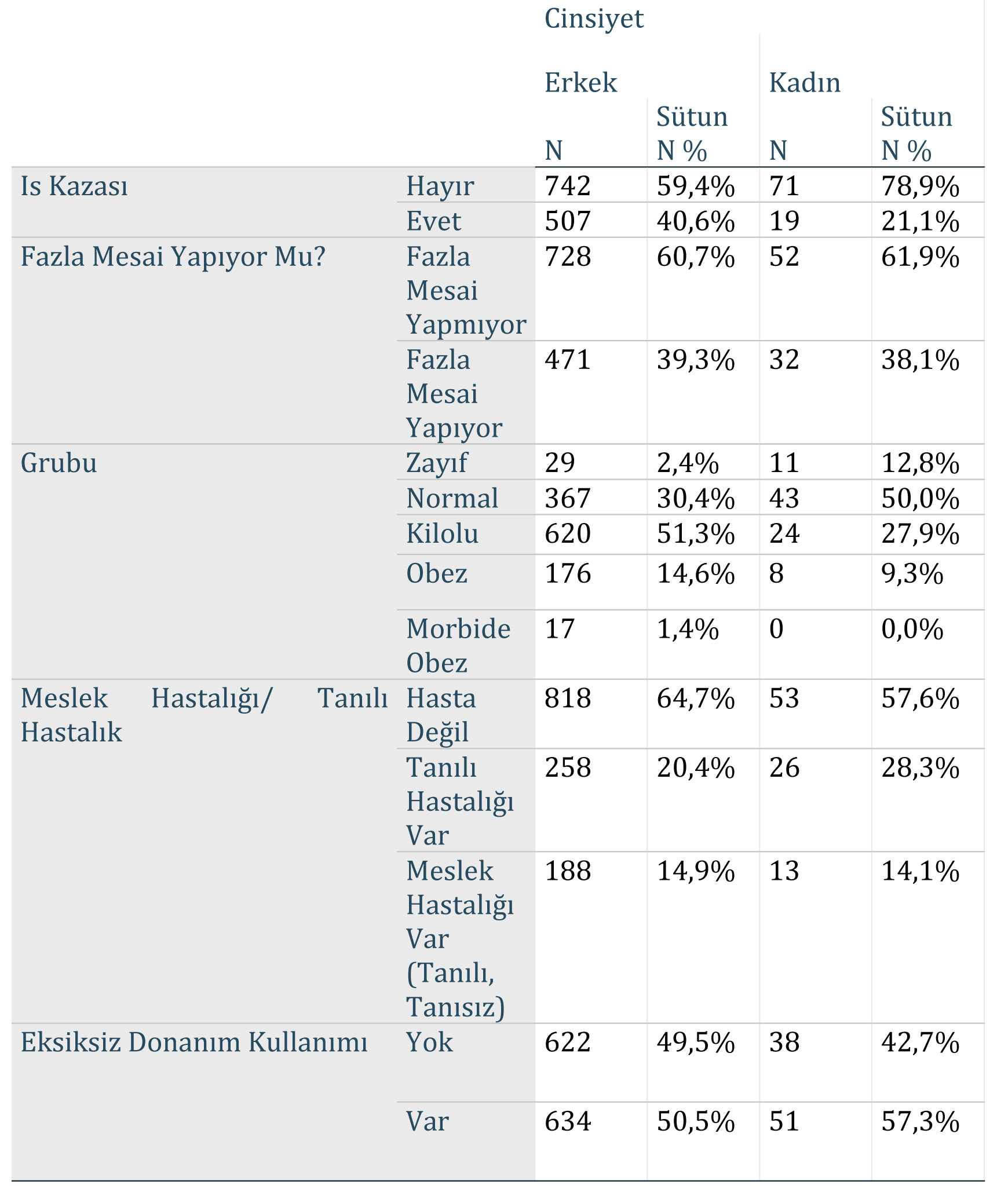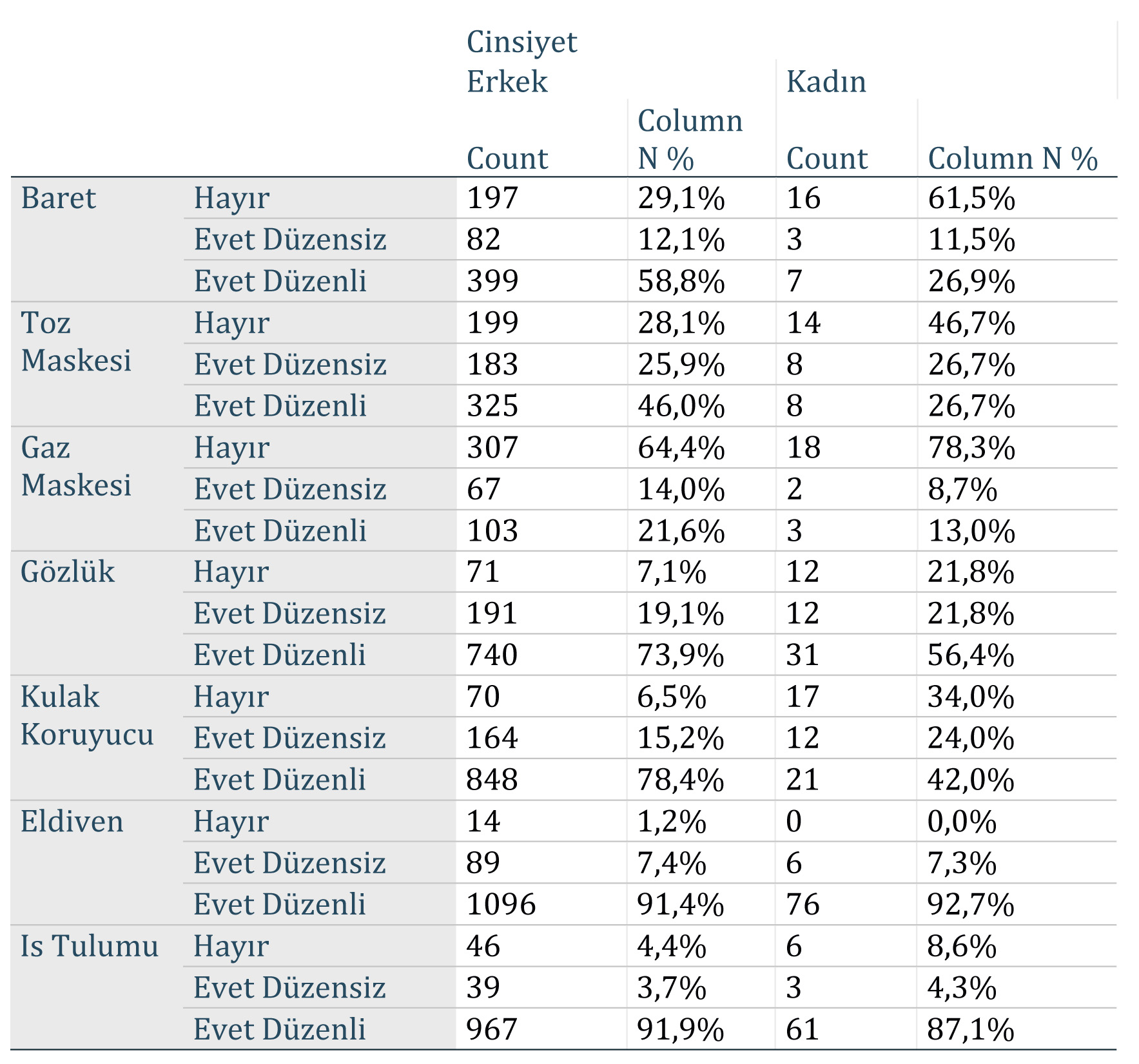 Kulak koruyucu ve gaz maskesi, düzensiz kullanılan koruyucu donanımlar arasındadır. Baret, gözlük ve kulak koruyucu kullanımında erkekler ve kadınlar arasında istatistiksel olarak anlamlı bir fark söz konusudur.