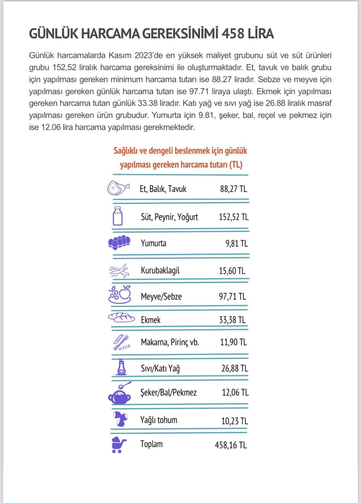 Günlük harcamalarda Kasım 2023’de en yüksek maliyet grubunu süt ve süt ürünleri grubu 152,52 liralık harcama gereksinimi ile oluşturmaktadır. Et, tavuk ve balık grubu için yapılması gereken minimum harcama tutarı ise 88.27 liradır. Sebze ve meyve için yapılması gereken günlük harcama tutarı ise 97.71 liraya ulaştı. Ekmek için yapılması gereken harcama tutarı günlük 33.38 liradır. Katı yağ ve sıvı yağ ise 26.88 liralık masraf yapılması gereken ürün grubudur. Yumurta için 9.81, şeker, bal, reçel ve pekmez için ise 12.06 lira harcama yapılması gerekmektedir.
