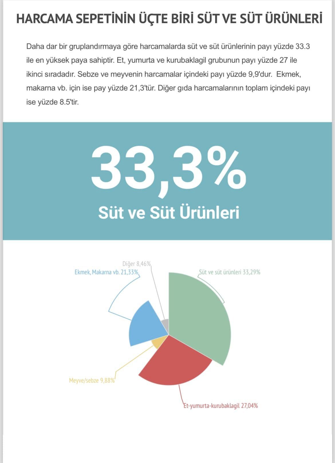 Daha dar bir gruplandırmaya göre harcamalarda süt ve süt ürünlerinin payı yüzde 33.3 ile en yüksek paya sahiptir. Et, yumurta ve kurubaklagil grubunun payı yüzde 27 ile ikinci sıradadır. Sebze ve meyvenin harcamalar içindeki payı yüzde 9,9’dur. Ekmek, makarna vb. için ise pay yüzde 21,3’tür. Diğer gıda harcamalarının toplam içindeki payı ise yüzde 8.5’tir.