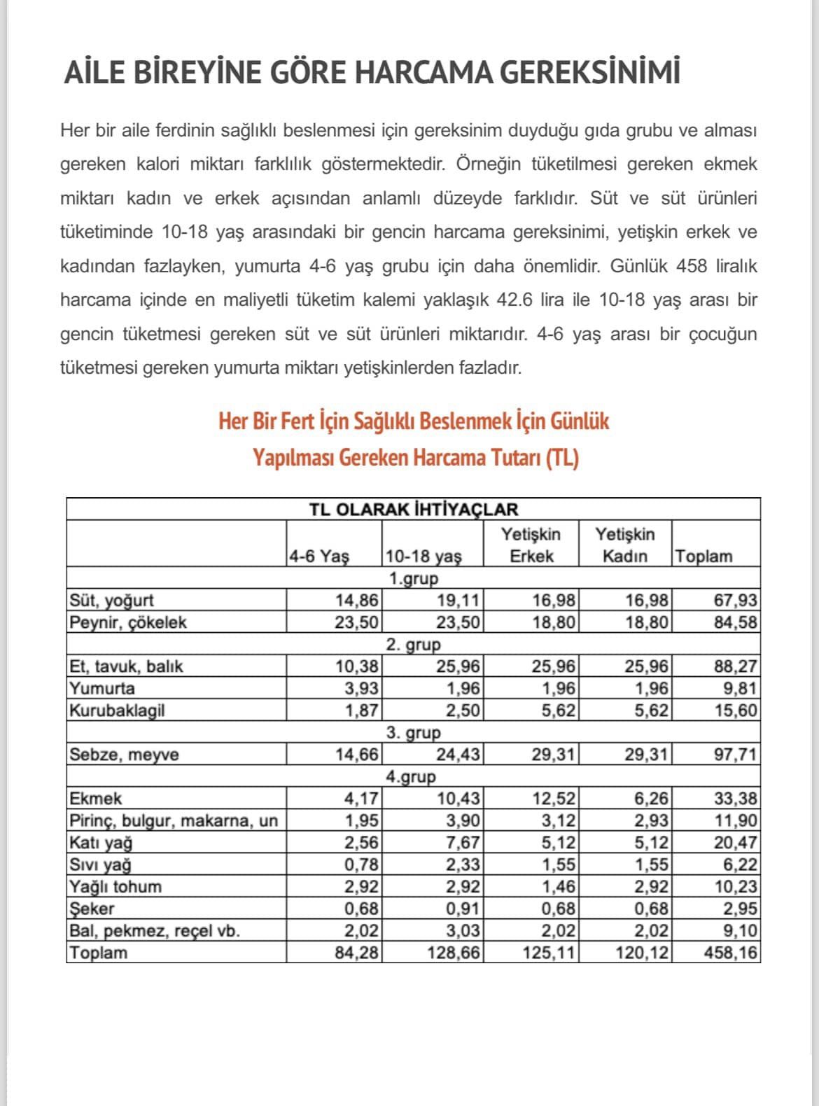 Her bir aile ferdinin sağlıklı beslenmesi için gereksinim duyduğu gıda grubu ve alması gereken kalori miktarı farklılık göstermektedir. Örneğin tüketilmesi gereken ekmek miktarı kadın ve erkek açısından anlamlı düzeyde farklıdır. Süt ve süt ürünleri tüketiminde 10-18 yaş arasındaki bir gencin harcama gereksinimi, yetişkin erkek ve kadından fazlayken, yumurta 4-6 yaş grubu için daha önemlidir. Günlük 458 liralık harcama içinde en maliyetli tüketim kalemi yaklaşık 42.6 lira ile 10-18 yaş arası bir gencin tüketmesi gereken süt ve süt ürünleri miktarıdır. 4-6 yaş arası bir çocuğun tüketmesi gereken yumurta miktarı yetişkinlerden fazladır.