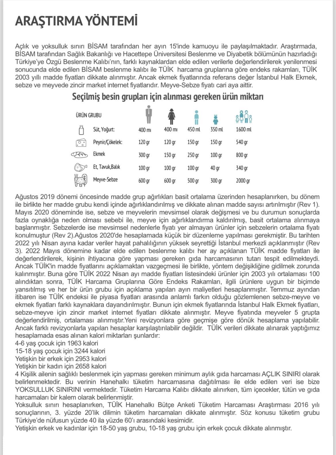 Açlık ve yoksulluk sınırı BİSAM tarafından her ayın 15’inde kamuoyu ile paylaşılmaktadır. Araştırmada, BİSAM tarafından Sağlık Bakanlığı ve Hacettepe Üniversitesi Beslenme ve Diyabetik bölümünün hazırladığı Türkiye’ye Özgü Beslenme Kalıbı’nın, farklı kaynaklardan elde edilen verilerle değerlendirilerek yenilenmesi sonucunda elde edilen BİSAM beslenme kalıbı ile TÜİK harcama gruplarına göre endeks rakamları, TÜİK 2003 yıllı madde fiyatları dikkate alınmıştır. Ancak ekmek fiyatlarında referans değer İstanbul Halk Ekmek, sebze ve meyvede zincir market internet fiyatlarıdır. Meyve-Sebze fiyatı cari aya aittir.