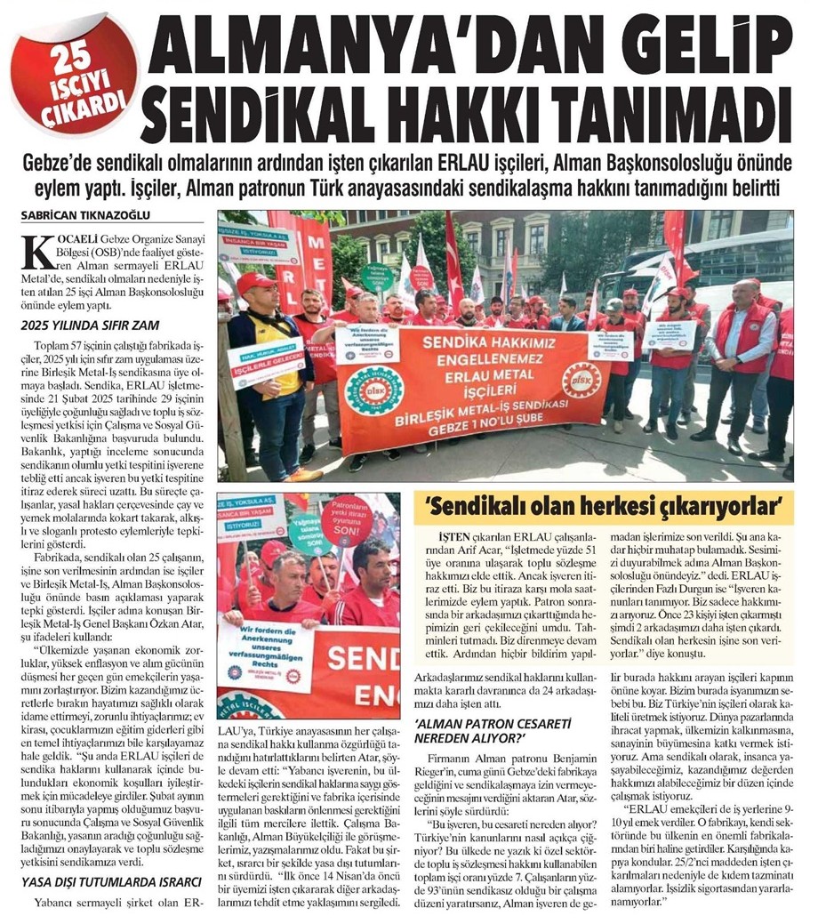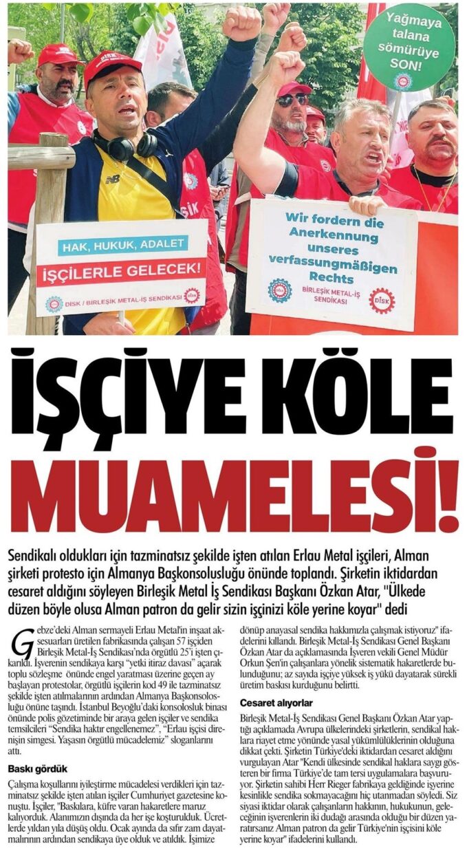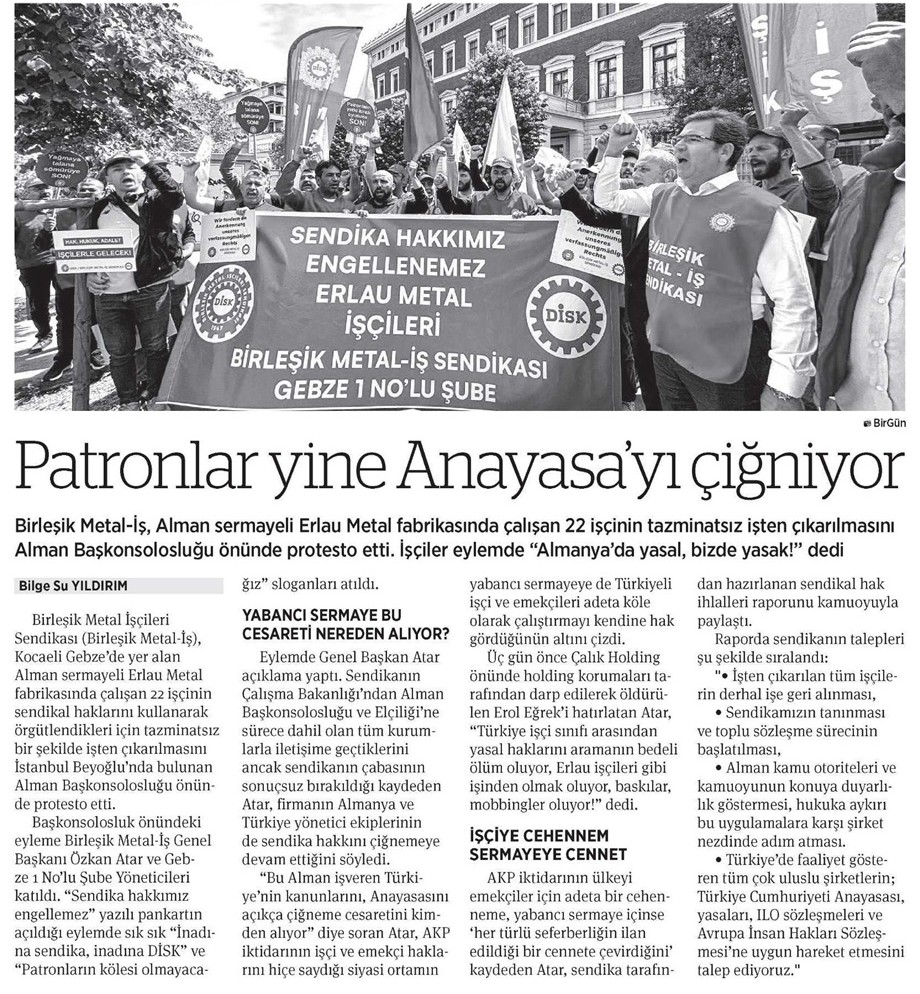Gebze’deki Erlau fabrikasında sendikalı oldukları için işten atılan ve anayasal sendika hakları için bir aydır direnişlerini sürdüren üyelerimizin Almanya Başkonsolosluğu önünde gerçekleştirdiği eylem, medyada geniş yer buldu.