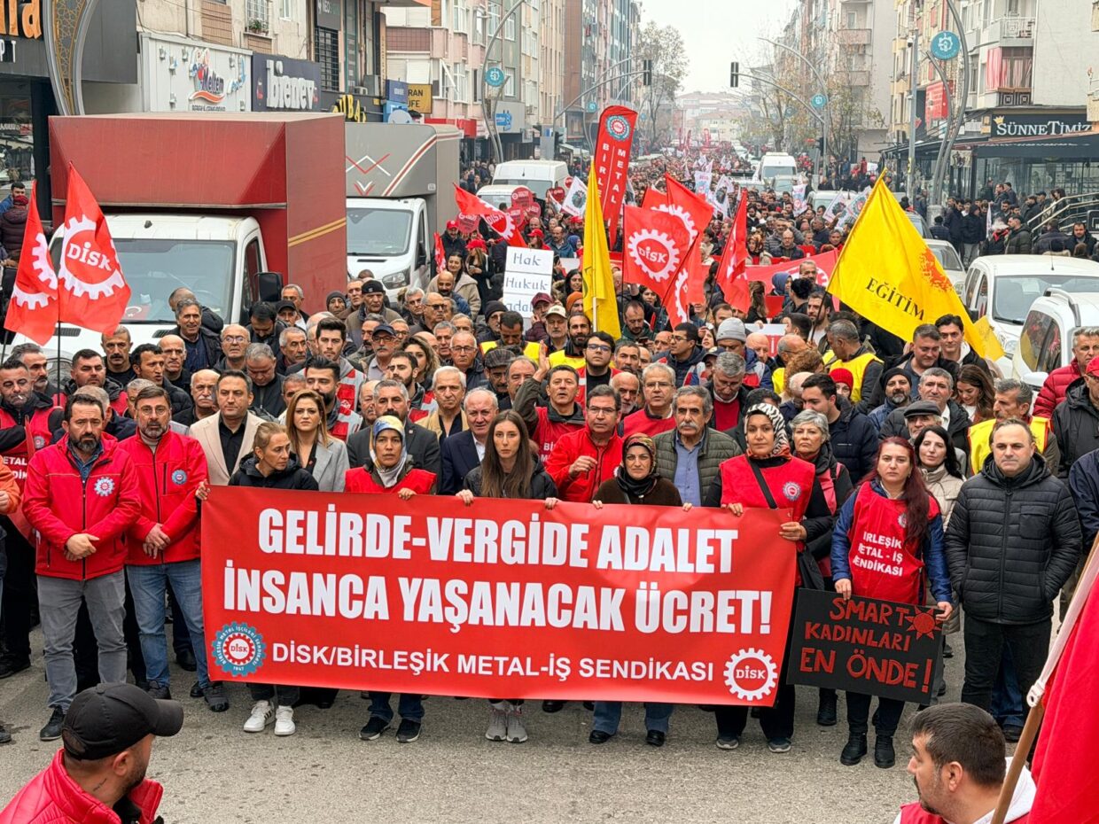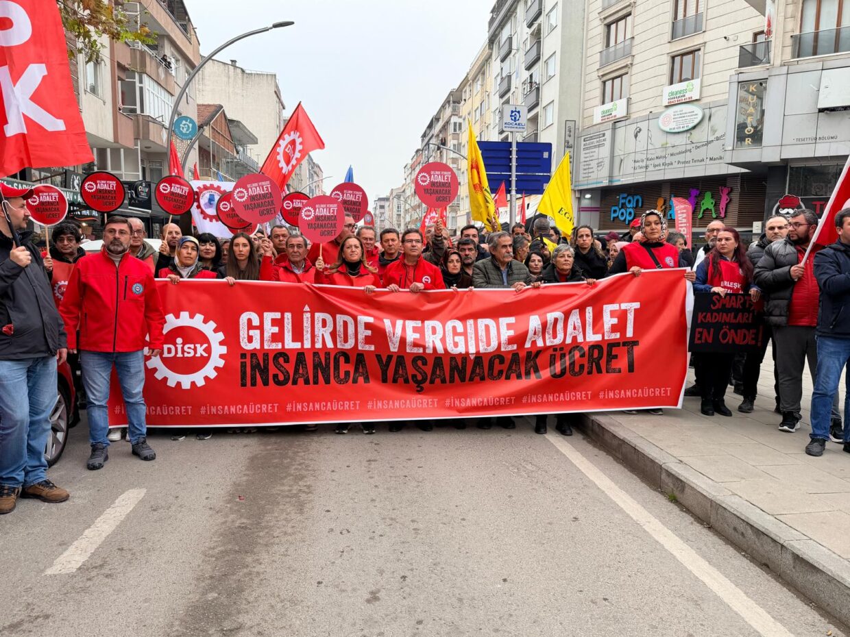 Gebze bugün tarihi günlerinden birini yaşadı. Adeta sel olup Gebze Kent Meydanına akan binlerce metal işçisi, MESS dayatmalarına karşı mücadele kararlılığını en güçlü şekilde gösterdi; sınıf kardeşleriyle omuz omuza yürüyerek insanca yaşam-insanca ücret, gelirde-vergide adalet talebini yükseltti. Konfederasyonumuz DİSK, “Gelirde-vergide adalet, insanca yaşanılacak ücret” talebiyle İstanbul Kartal Neyzen Tevfik Meydanı’ndan Ankara’ya doğru yürüyüşe geçti. Yürüyüş, ilk durağı olan Gebze’de binlerce metal işçisinin ve diğer işkollarından işçilerin katılımıyla mitinge döndü. Trafo Meydanı’nda toplanan binlerce metal işçisi, “İşçiler açken patronlara huzur yok”, MESS şaşırma, sabrımızı taşırma!”, “İnsanca yaşam insanca ücret”, “Gelirde adalet vergide adalet”, “İşgal grev direniş”, “Direne direne kazanacağız” sloganlarıyla Gebze Kent Meydanı’na doğru yürüyüşe geçti. Grevdeki Smart Solar işçilerinin en önde yürüdüğü kortejimizde Dilovası Katliamı’nda yaşamını yitiren 3’ü çocuk 6 kadın işçinin isimleri de taşındı. Yürüyüşe sendikamızla birlikte DİSK’e bağlı kardeş sendikalarımız, Gebze Sendikalar Birliği bileşenleri, Petrol-İş, Tekgıda-İş, Eğitim Sen, […]