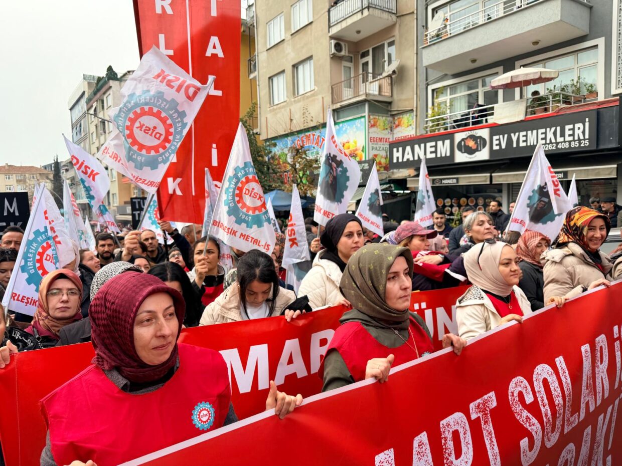 Trafo Meydanı’nda toplanan binlerce metal işçisi, “İşçiler açken patronlara huzur yok”, MESS şaşırma, sabrımızı taşırma!”, “İnsanca yaşam insanca ücret”, “Gelirde adalet vergide adalet”, “İşgal grev direniş”, “Direne direne kazanacağız” sloganlarıyla Gebze Kent Meydanı’na doğru yürüyüşe geçti. Grevdeki Smart Solar işçilerinin en önde yürüdüğü kortejimizde Dilovası Katliamı’nda yaşamını yitiren 3’ü çocuk 6 kadın işçinin isimleri de taşındı.