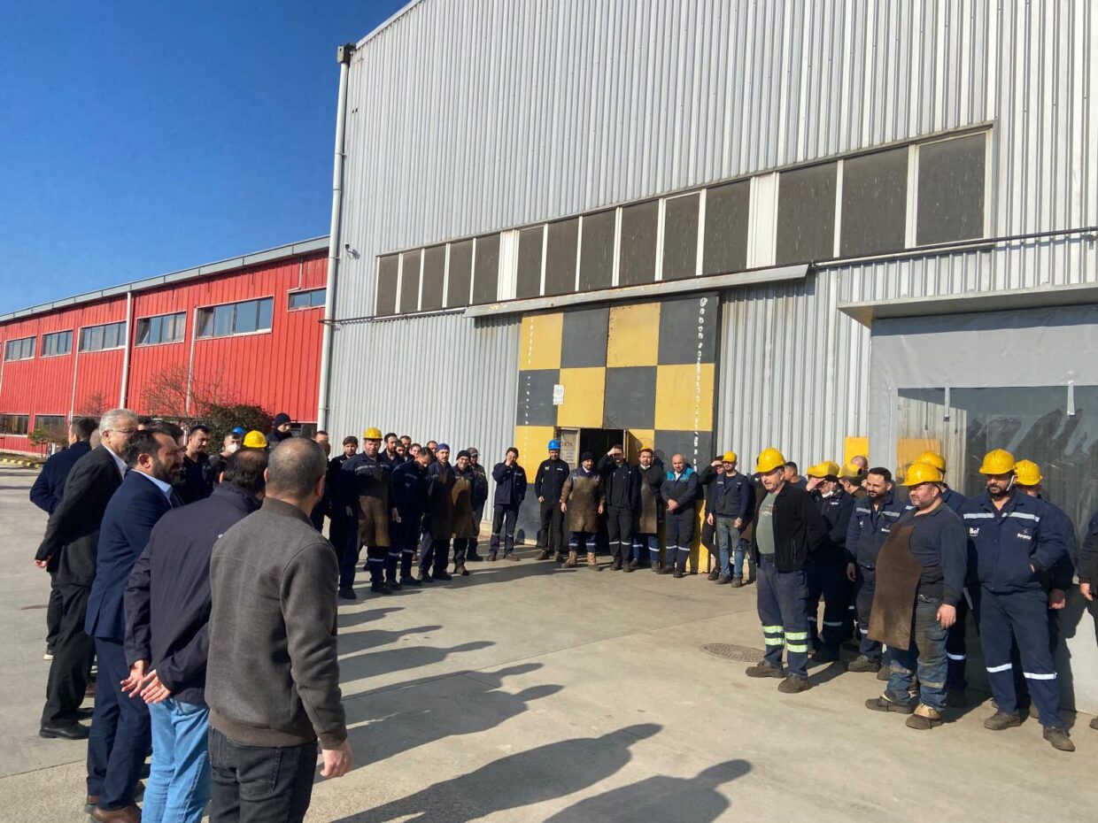 İskenderun Organize Sanayi Bölgesi’nde Befesa Silvermet işyerindeki üyelerimizi kapsayan ve çıkılan grevin 61. Gününde üyelerimizin memnuniyeti ve onayı ile toplu iş sözleşmemiz imzalanmıştı. DİSK Genel Başkan Yardımcısı, Sendikamız Genel Başkanı Özkan Atar, Sendikamız Genel Sekreteri Ali Çeltek ve Anadolu Şube yöneticilerimizle birlikte bugün Befesa Silvermet işyerini ziyaret etti. İşyerinde düzenlenen pasta töreninde konuşan Genel Başkanımız; İmzalanan sözleşmenin üyelerimize, işyerine ve sendikamıza hayırlı olması dileklerini paylaştı.