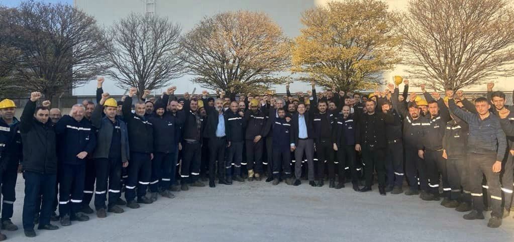 İskenderun Organize Sanayi Bölgesi’nde Befesa Silvermet işyerindeki üyelerimizi kapsayan ve çıkılan grevin 61. Gününde üyelerimizin memnuniyeti ve onayı ile toplu iş sözleşmemiz imzalanmıştı. DİSK Genel Başkan Yardımcısı, Sendikamız Genel Başkanı Özkan Atar, Sendikamız Genel Sekreteri Ali Çeltek ve Anadolu Şube yöneticilerimizle birlikte bugün Befesa Silvermet işyerini ziyaret etti. İşyerinde düzenlenen pasta töreninde konuşan Genel Başkanımız; İmzalanan sözleşmenin üyelerimize, işyerine ve sendikamıza hayırlı olması dileklerini paylaştı.