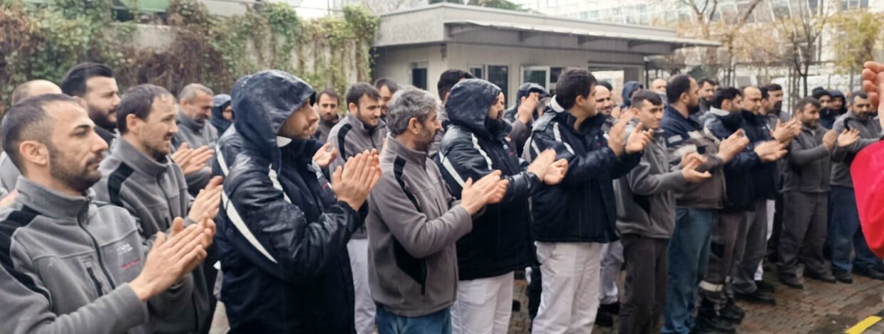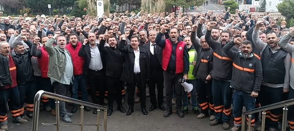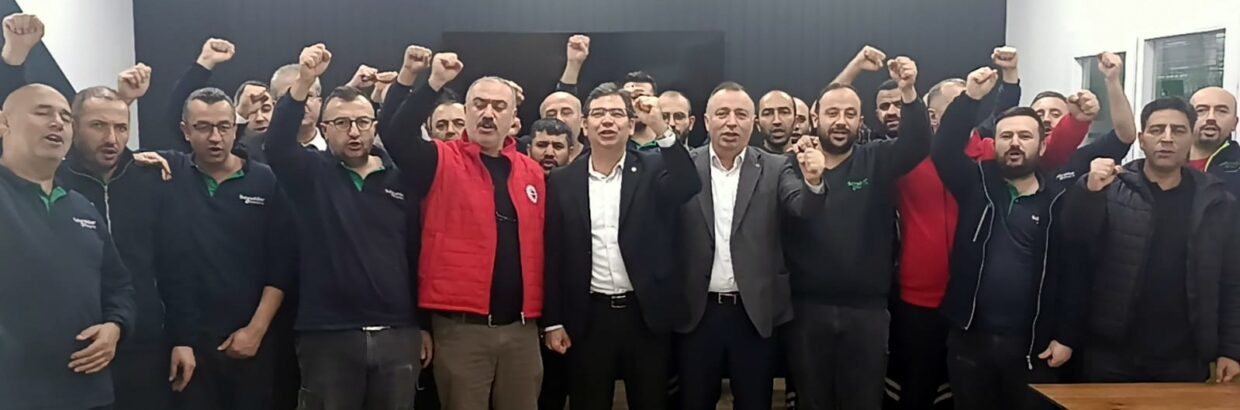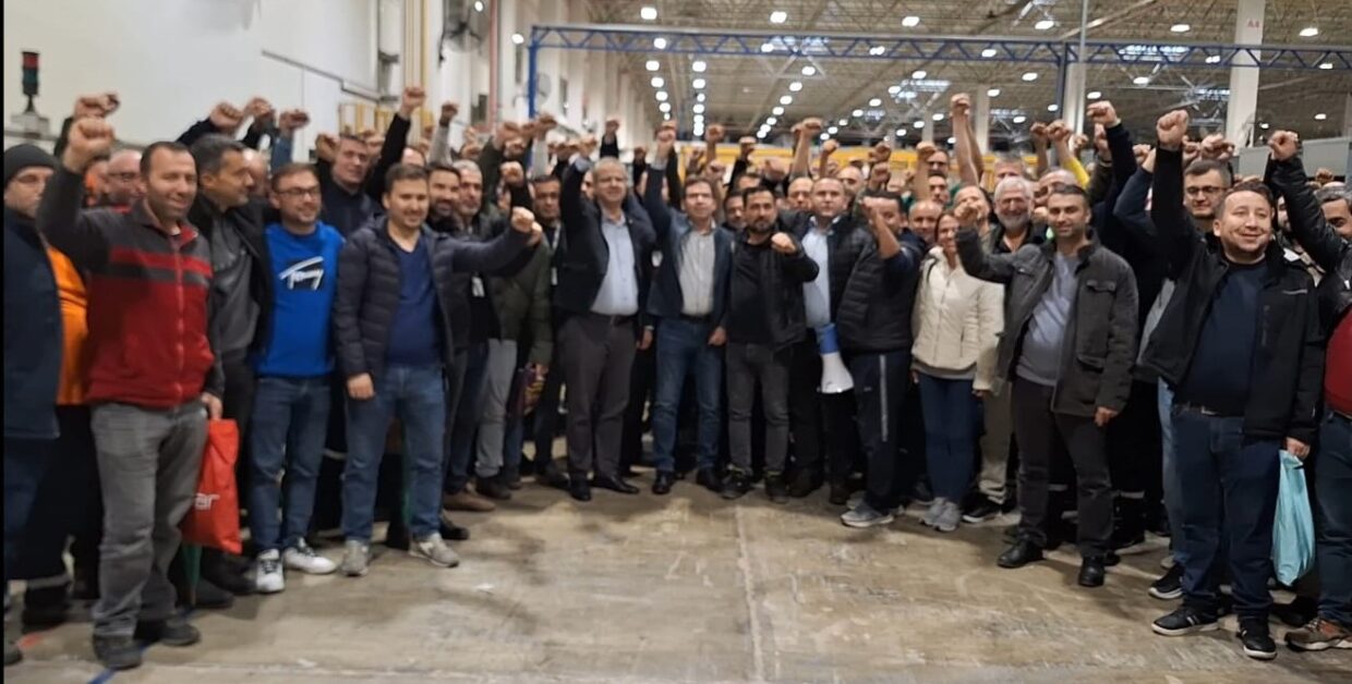 Merkez yöneticilerimiz, 13 Aralık'ta greve çıkmaya hazırlanan Schneider Elektrik işçileriyle birlikte... Sendikamızın Genel Başkanı Özkan Atar ve Genel Sekreteri Ali Çeltek, Gebze 2 Nolu Şubemizin yöneticileriyle birlikte bu sabah Schneider Elektrik'in Kocaeli Çayırova'daki fabrikasını ziyaret ederek üyelerimizle bir araya geldi. MESS toplu sözleşmesi ile grev süreciyle ilgili bilgi ve görüş paylaşımında bulunan üyelerimiz ve yöneticilerimiz, hep bir ağızdan "Şalter inecek, bu iş bitecek!", "İşgal grev direniş!", "İnsanca bir ücret istiyoruz!" sloganları attı.