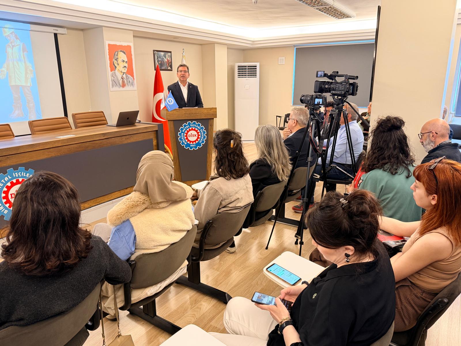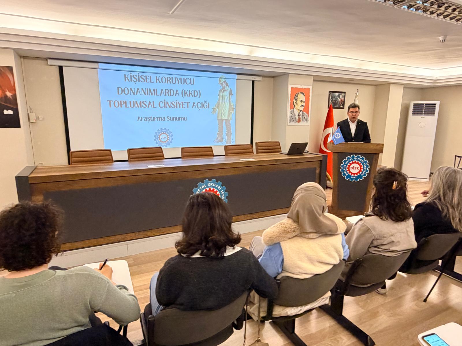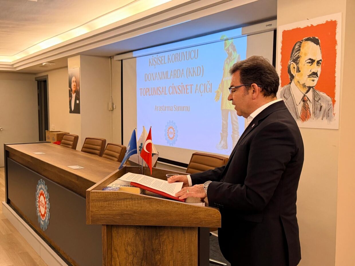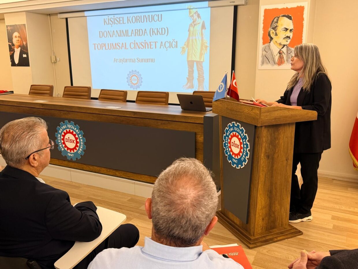 Bugün burada, sendikamızın İşçi Sağlığı ve İş Güvenliği Dairesi ile Sınıf Araştırmaları Merkezi’nin (BİSAM) gerçekleştirdiği, kişisel koruyucu donanımların toplumsal cinsiyet boyutunu ortaya çıkarmayı hedefleyen çalışmanın sonuçlarını paylaşmak üzere bir araya geldik.