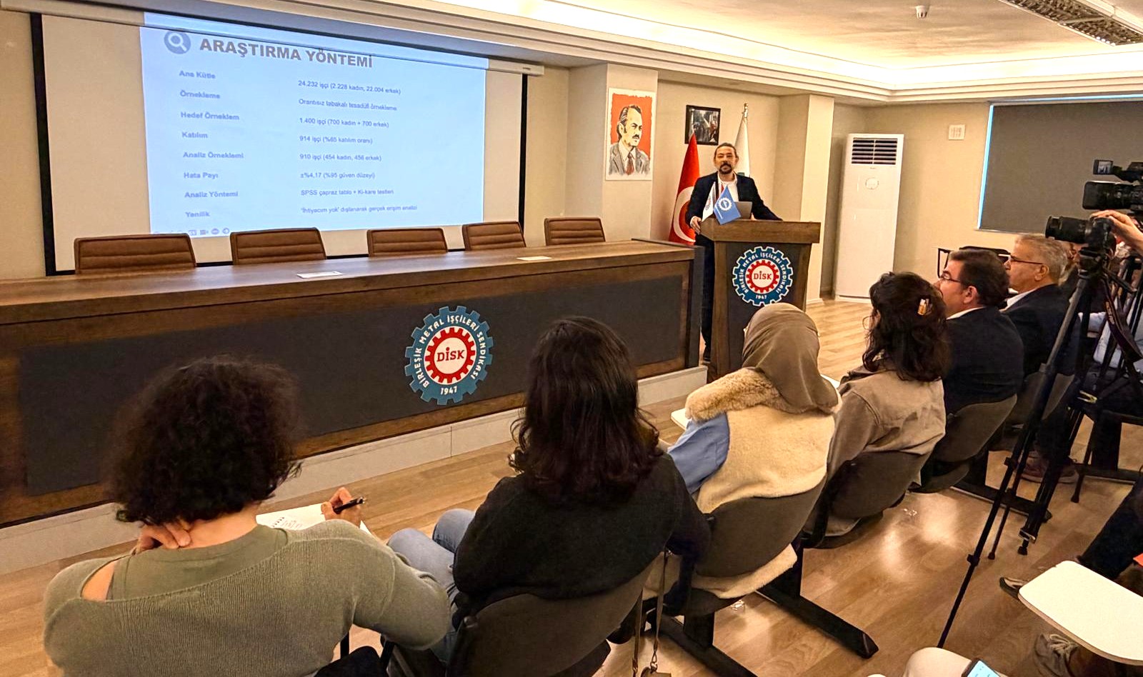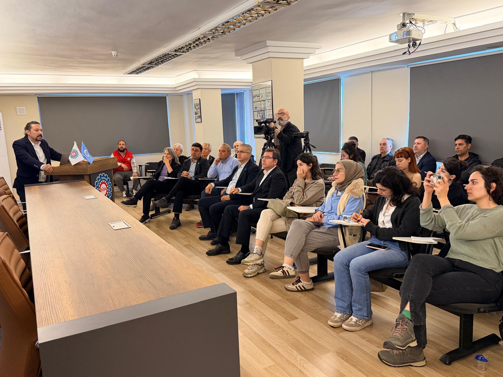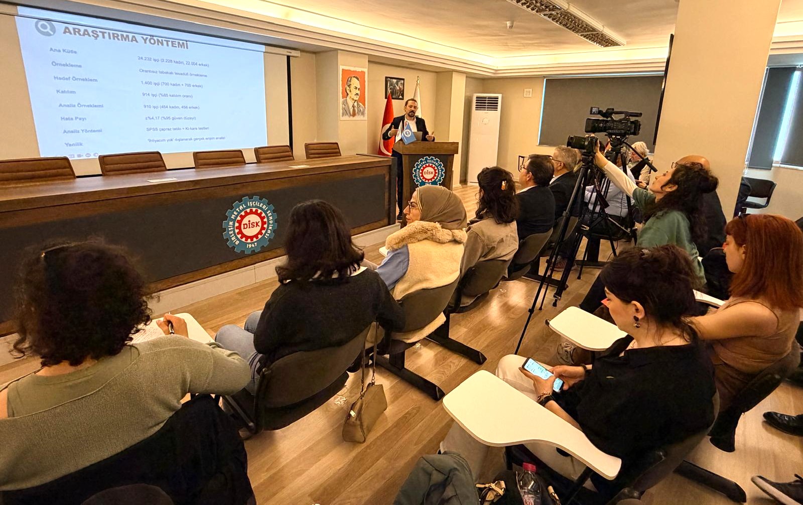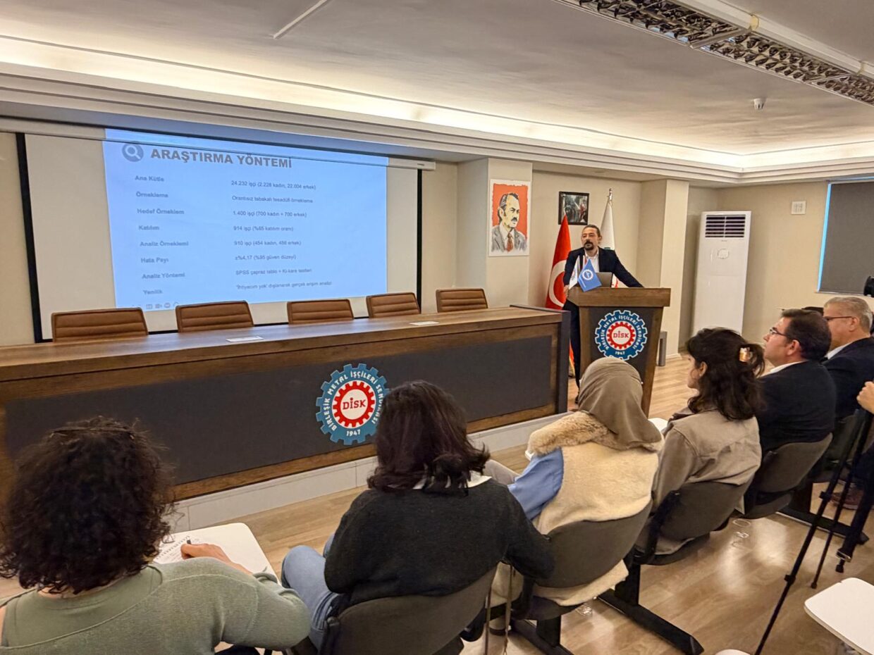 Bugün burada, sendikamızın İşçi Sağlığı ve İş Güvenliği Dairesi ile Sınıf Araştırmaları Merkezi’nin (BİSAM) gerçekleştirdiği, kişisel koruyucu donanımların toplumsal cinsiyet boyutunu ortaya çıkarmayı hedefleyen çalışmanın sonuçlarını paylaşmak üzere bir araya geldik.