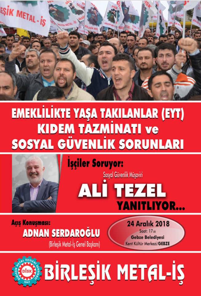 03.01.2018 150 bin civarında işçiyi ve ailelerini ilgilendiren metal işkolu grup toplu iş sözleşmesi uyuşmazlık aşaması geride kalmış ve yarın Ankara’da yapılacak arabulucu toplantısı sonrası grev kararları için geri sayım başlamıştır. MESS teklifleri içerisinde yer alan başta 3 yıllık toplu sözleşme olmak üzere, ücret zam teklifi, sosyal haklar için verilen teklif ve kazanılmış hakları geriye götürmeyi amaçlayan tekliflerine karşı  Metal işçileri 4 Ocak 2018 PERŞEMBE günü Saat: 17.00’de GEBZE Cumhuriyet Meydanı’nda BULUŞUYOR! Sendikamız ile MESS arasında yürütülen MESS grup toplu iş sözleşme görüşmelerinde tutulan uyuşmazlık sonrası, metal işçileri, işyerlerinde bildiri okuma, fabrika önü basın açıklamaları, iş bırakma, fazla mesaiye kalmama, işyerlerine toplu yürüyüşler vb. eylemlerden sonra ALANLARDA! Genel Başkanımız Adnan SERDAROĞLU’nun ve bölgedeki üyelerimizin katılımıyla düzenlenecek basın açıklamasında metal işçileri bir kez daha MESS’i uyarıyor ve TALEPLERİNİ HAYKIRIYORLAR! Tüm metal işçilerini, emek dostlarını ve basın emekçilerini GEBZE’de düzenlenecek basın açıklamamıza […]