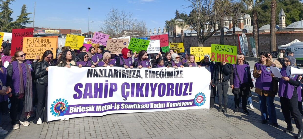 Merkez Kadın Komisyonumuzun çağrısıyla Gebze’de eylem yapan kadın üyelerimiz, "Emeğimize, haklarımıza sahip çıkıyoruz!" diyerek eşitlik ve özgürlük taleplerini yükseltti.Eyleme Gebze 1, Gebze 2 ve Bursa şubelerimize bağlı fabrikalardan kadın işçiler katıldı. Kadın üyelerimiz, basın açıklamasının yapılacağı Gebze Kent Meydanı'na sloganlarla yürüdü. "Yaşasın 8 Mart, yaşasın kadın dayanışması!", "ILO 190 onaylansın, 6284 uygulansın!", "İstanbul Sözleşmesi'nden vazgeçmiyoruz!", "Kadın yaşam özgürlük!", "Her kadına sendikalı, güvenceli iş, her işyerine kreş" bu sloganlar arasındaydı.Metal işçisi kadınlar, Kaynak Tekniği (Lincoln) işçilerinin grevini de selamladı, "Yanınızdayız!" dedi. Kadın Komisyonumuzun basın açıklaması metni: Emeğimize, haklarımıza sahip çıkıyoruz! Kadınlar örgütlü mücadelesi ve dayanışmasıyla, tarih boyunca seçme-seçilme hakkından kürtaj hakkına, çalışma hakkından medeni hukuka kadar kamusal ve özel alana yönelik nice kazanımlar elde etti. Eşit ve özgür bir dünya kuruluncaya kadar da mücadelemiz devam edecek. 2025 yılı ile birlikte, demokratik hakkımız olan düşünce ve ifade özgürlüğüne, laikliğe, grev hakkına, kadınların […]