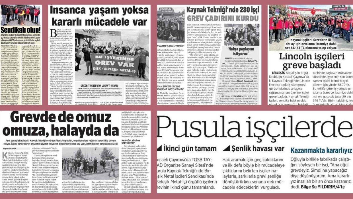 Chinatool Otomotiv fabrikasında toplu iş sözleşmesi görüşmelerinde anlaşma sağlanamaması nedeniyle grevimiz başladı. Kocaeli Gebze Plastikçiler Organize Sanayi Bölgesi’nde faaliyet gösteren, otomotiv parçaları üreten, İngiliz sermayeli Chinatool Otomotiv’de (CT Otomotiv) ağırlıklı olarak kadın işçiler çalışıyor. Bu fabrikada sürdürdüğümüz 3’üncü dönem toplu iş sözleşmesi görüşmelerinde işverenin son olarak yüzde 25 oranında ücret zammı teklif etmesi nedeniyle bugün itibarıyla 130’u kadın 183 üyemizle grev pankartımızı astık. “Direne direne kazanacağız”, “İşçilerin birliği sermayeyi yenecek”, “Yaşasın onurlu grevlerimiz” sloganlarıyla yürüyerek fabrikadan çıkan Chinatool işçileri, aralarında Kaynak Tekniği ve Green Transfo grevcileri ile örgütlü olduğumuz diğer fabrikalardan temsilcilerimizin de olduğu sınıf kardeşleriyle buluştu. Nakliyat-İş, Petrol-İş, Eğitim-İş, Emekli Sen, DİP, TÖP, TİP, TKP, EMEP’in de aralarında olduğu sendikalar, demokratik kitle örgütleri, siyasi partiler ile EMEP Milletvekili İskender Bayhan ve eski HDP Milletvekili Musa Piroğlu da Chinatool işçilerini yalnız bırakmadı. Sendikamızın Genel Başkanı Özkan Atar, Türkiye’de işçi ve […]